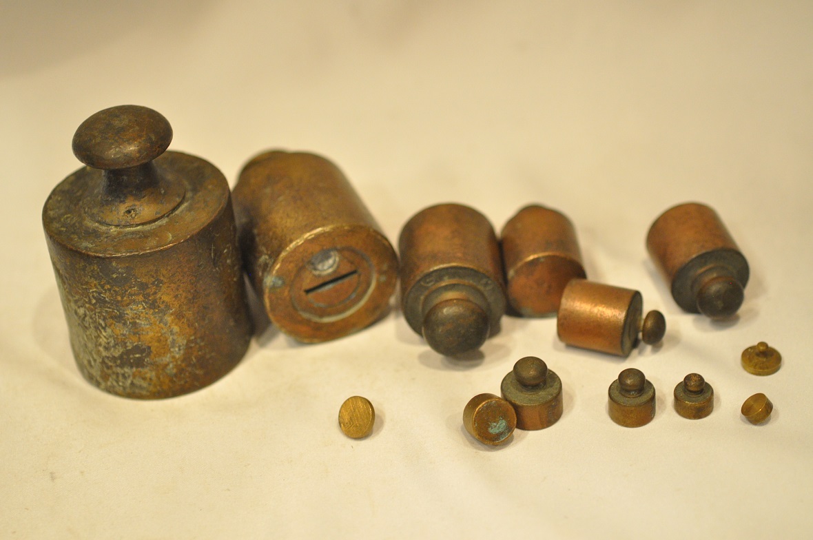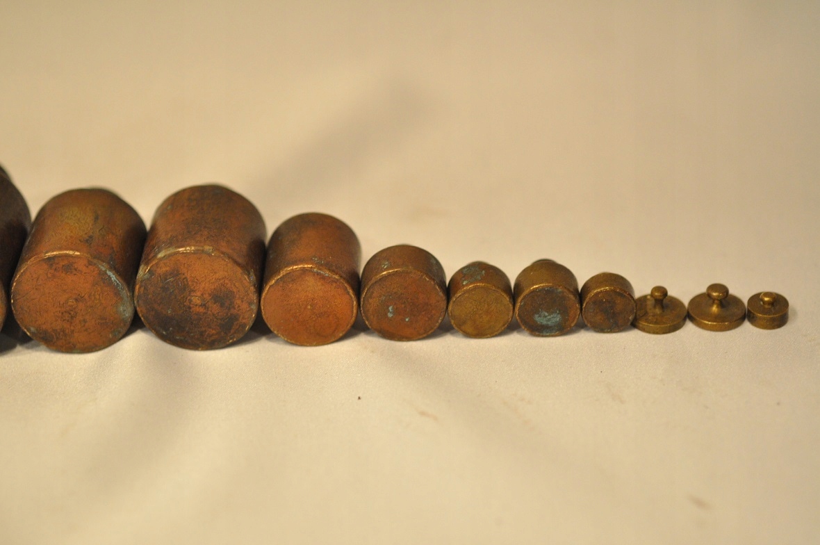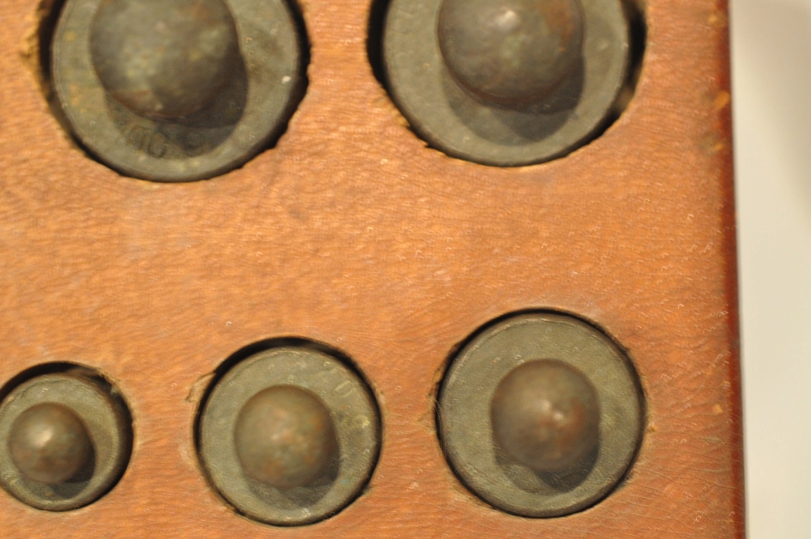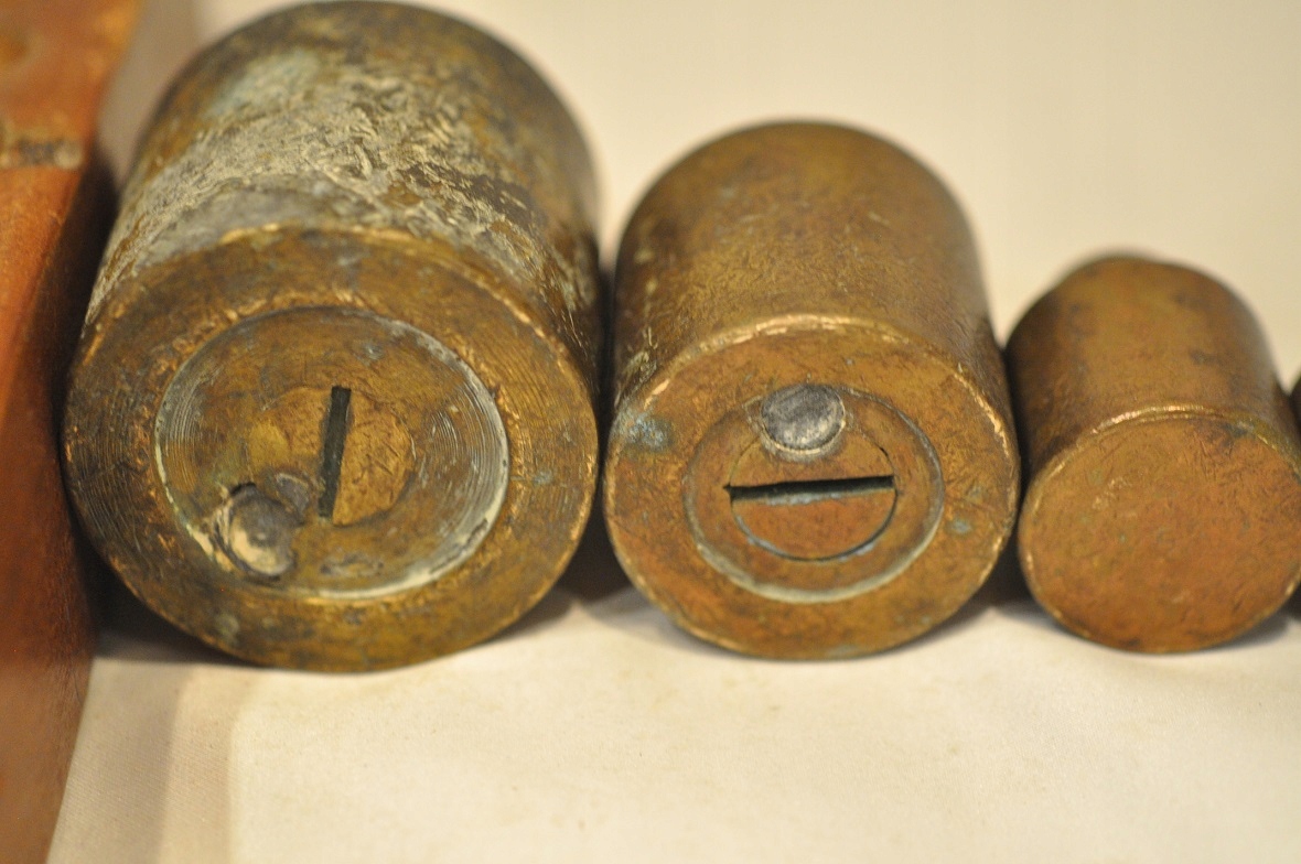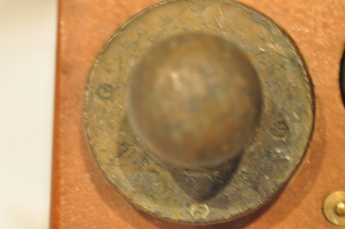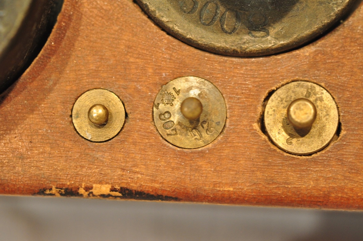 Нижняя часть самых больших гирь (1 кг, 500 г) имеет навинчивающиеся проверочные гнезда, закрытые проверочными вставками - разборчивых проверочных знаков нет.