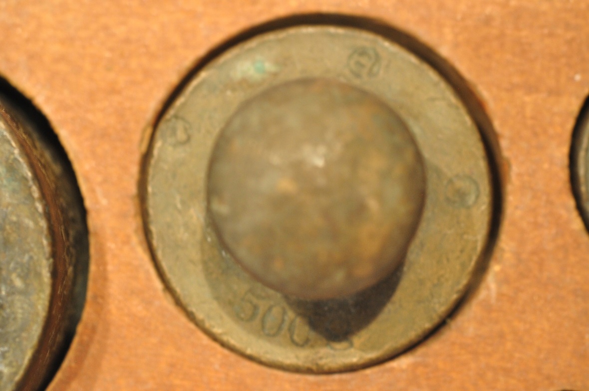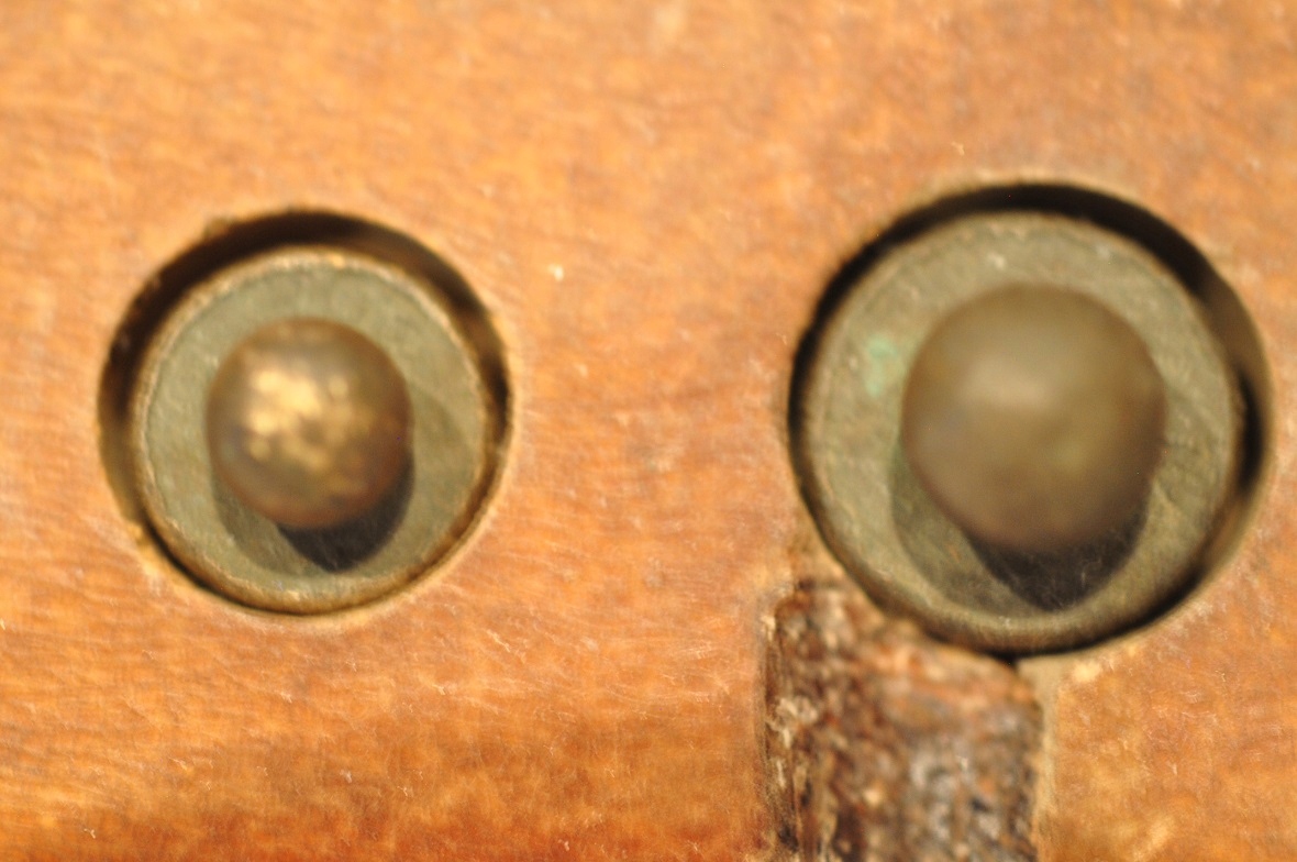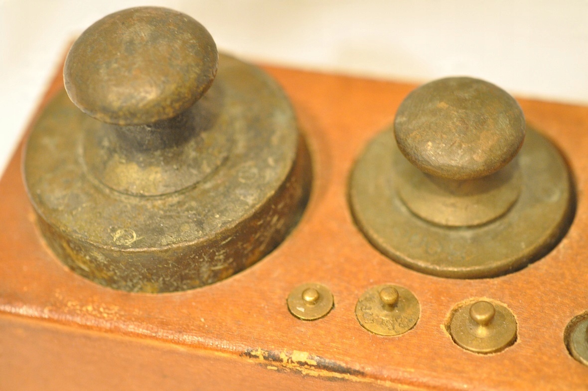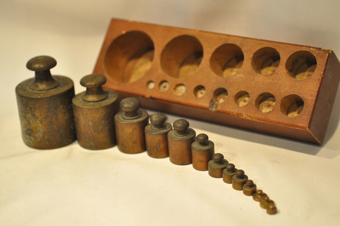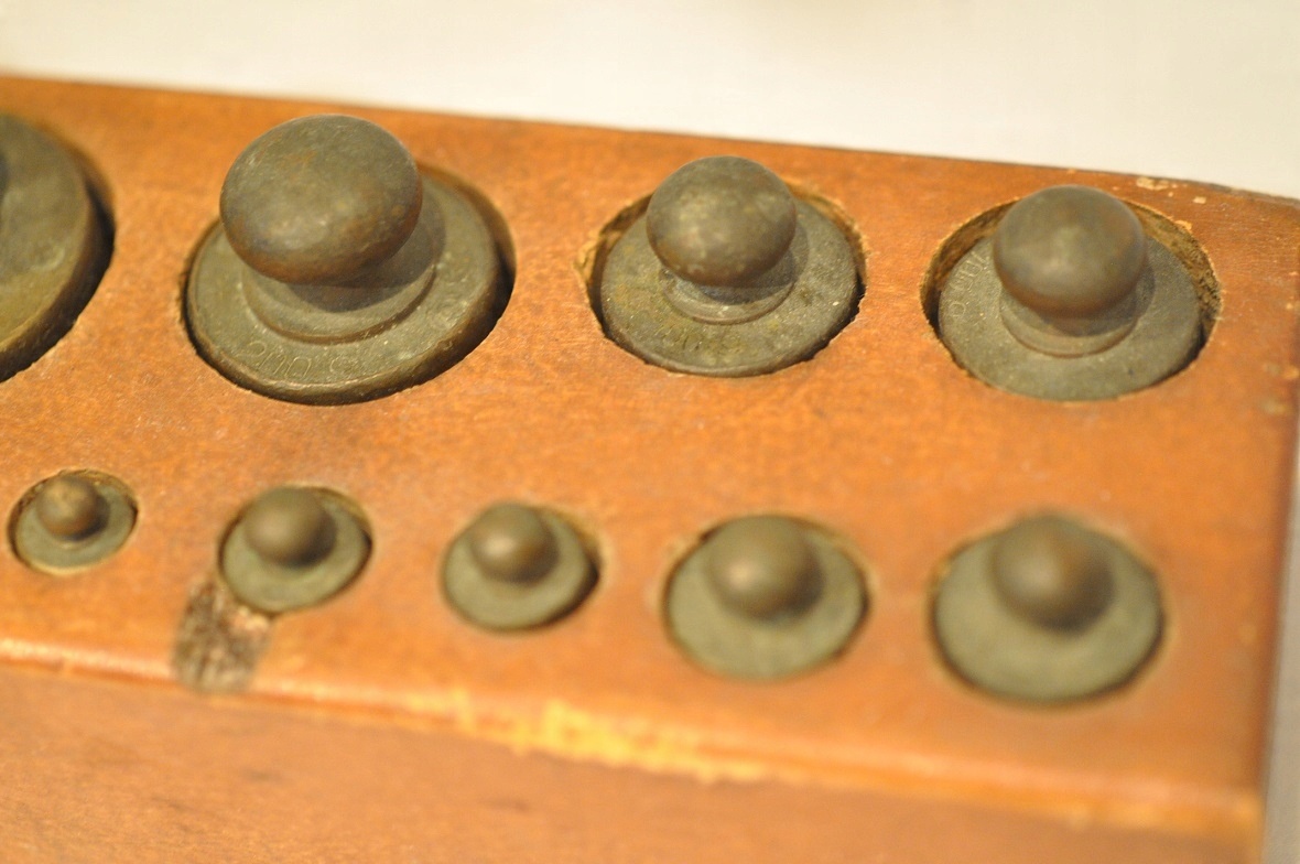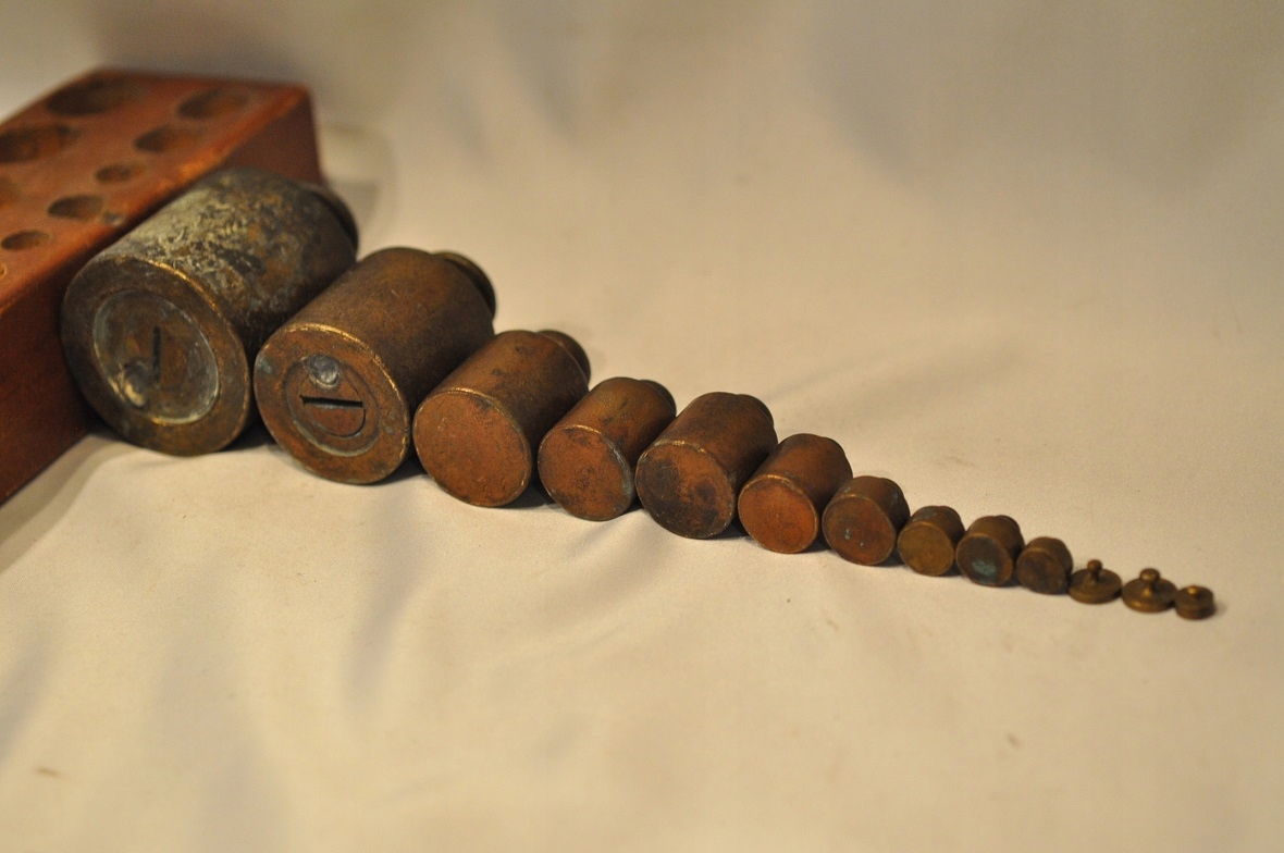 Нижняя часть самых больших гирь (1 кг, 500 г) имеет навинчивающиеся проверочные гнезда, закрытые проверочными вставками - разборчивых проверочных знаков нет.