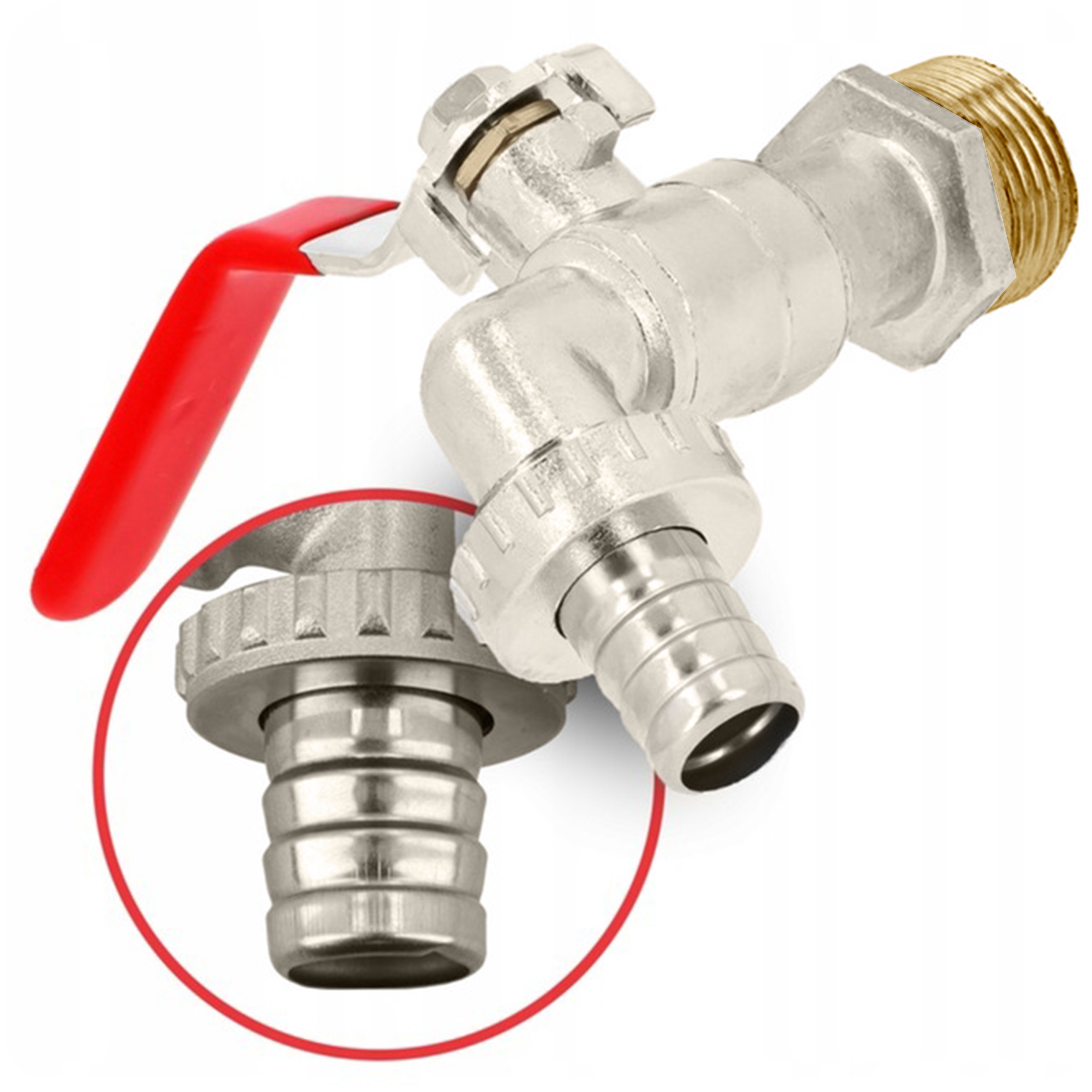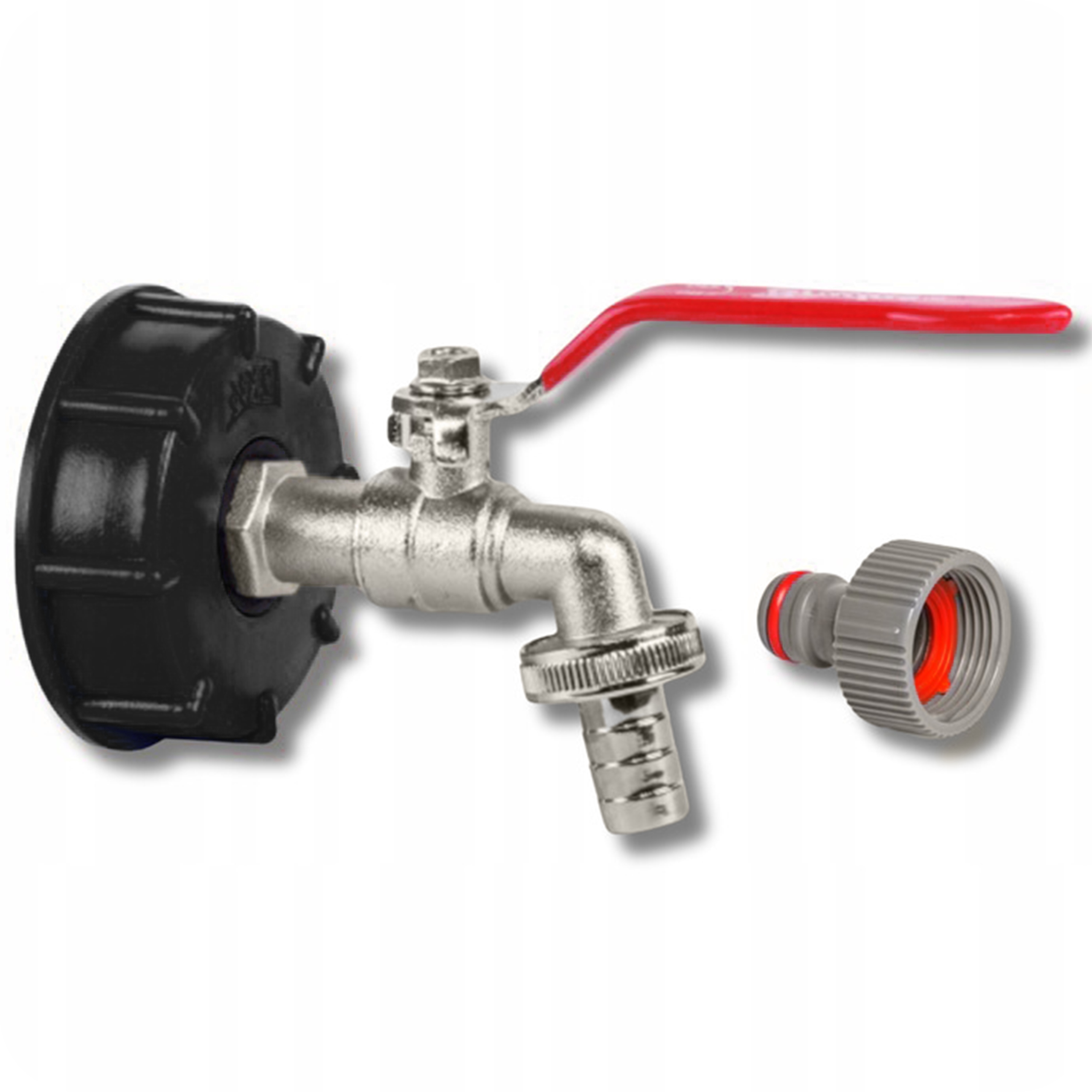 Кран завершен садовым разъемом, который вместе с регулируемым клапаном дает возможность поливать водой непосредственно из резервуара IBC