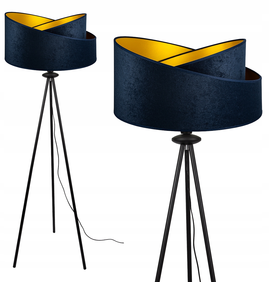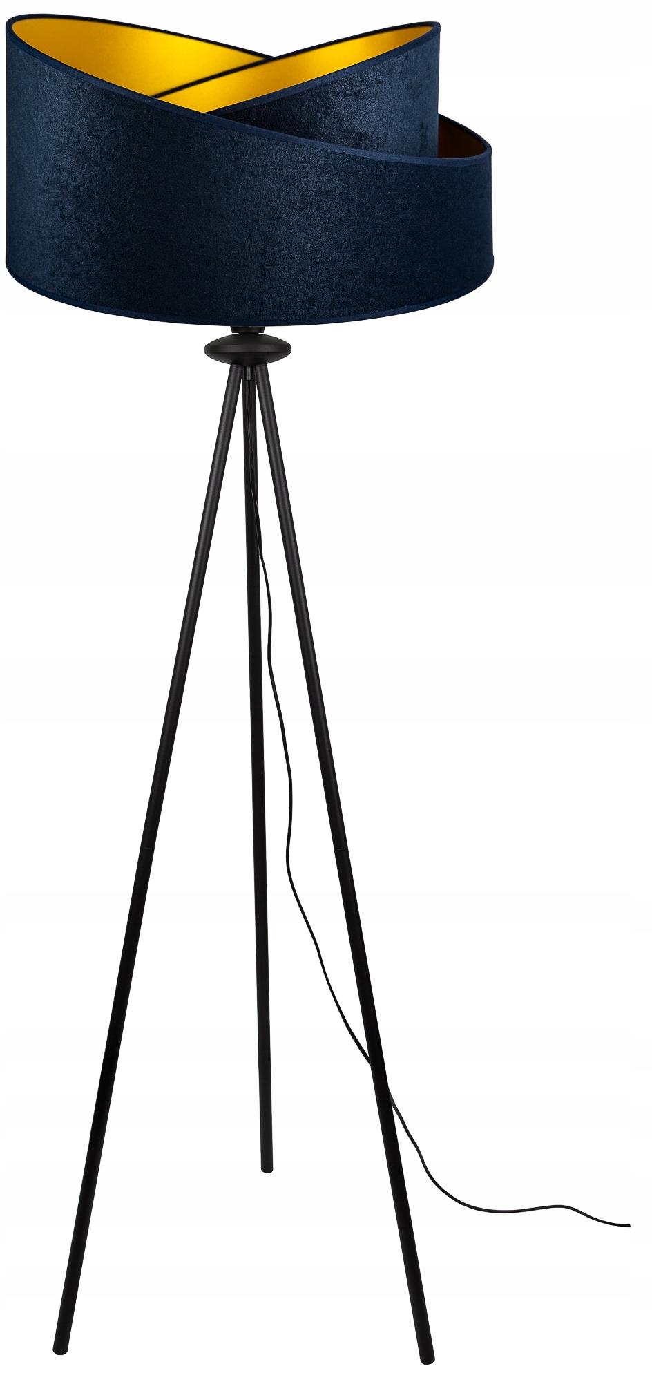 Торшер-треножник с бархатным абажуром темно-синего цвета и золотым центром, 45 см.