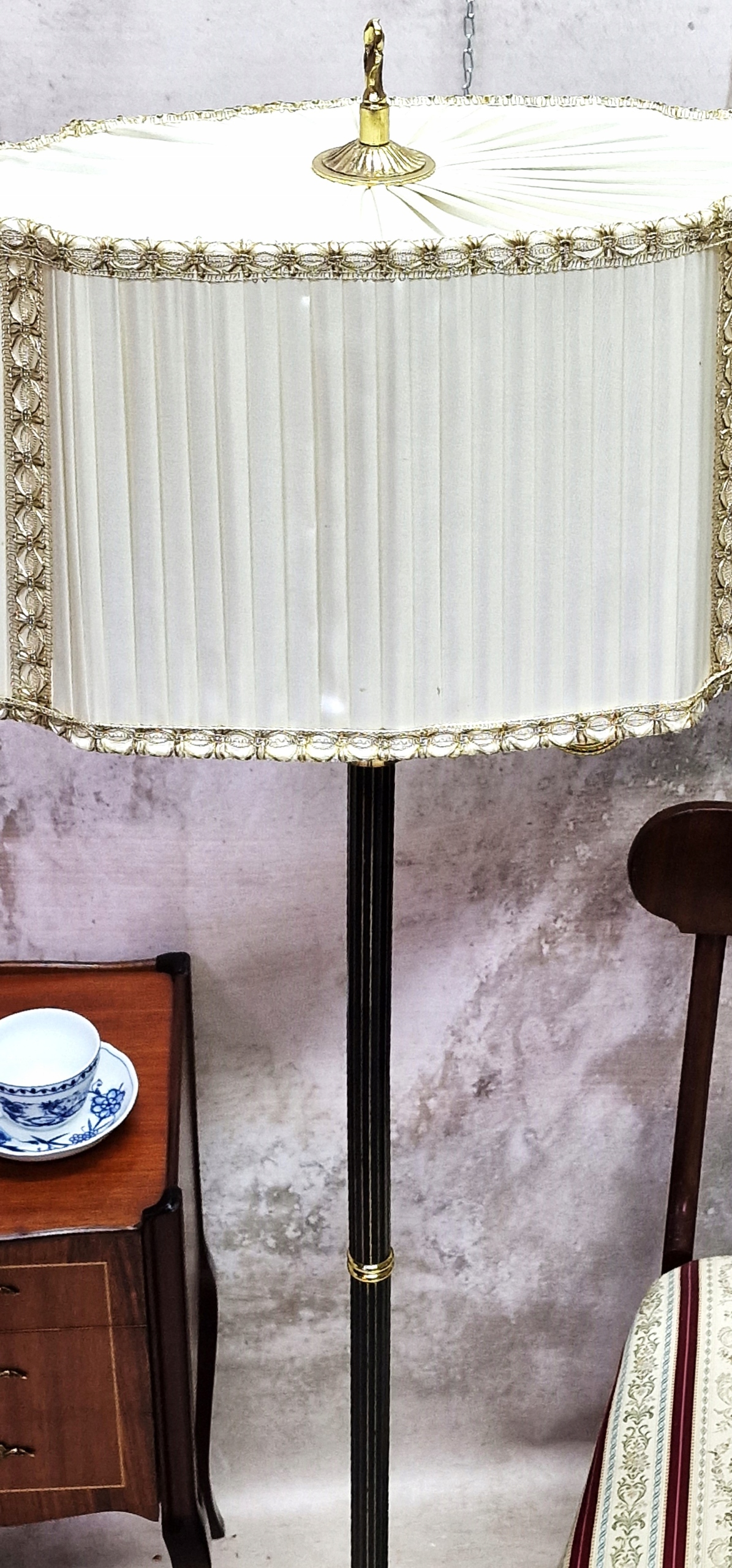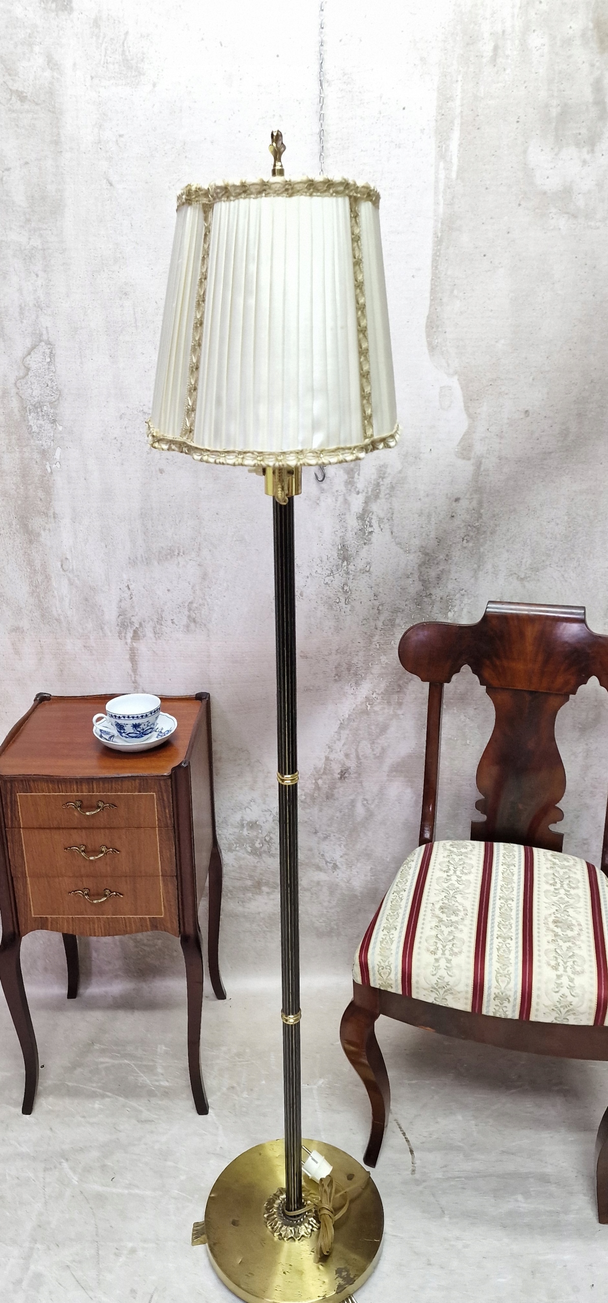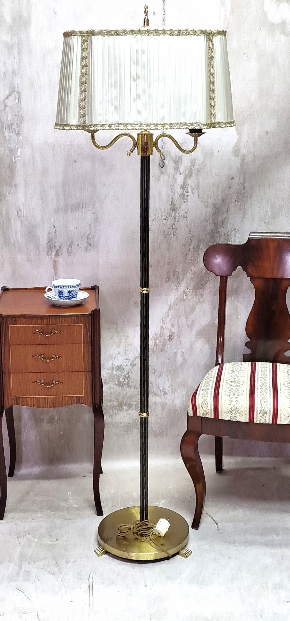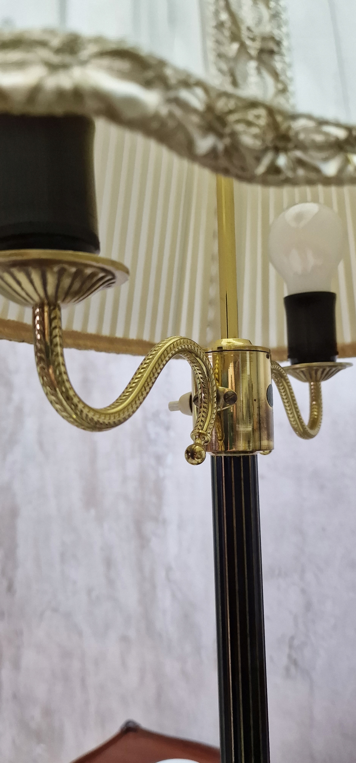 необычный латунный торшер с абажуром.