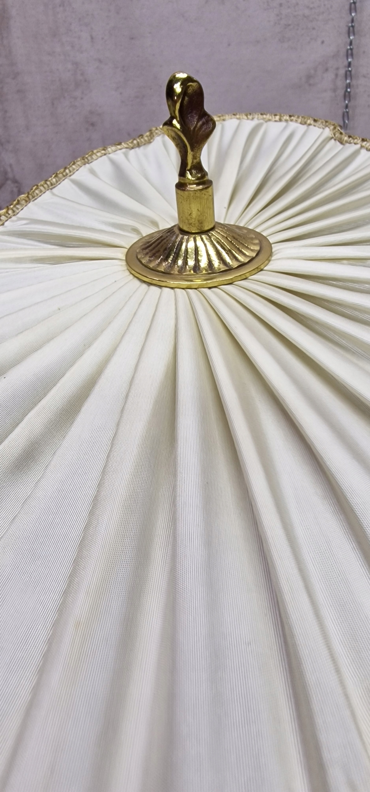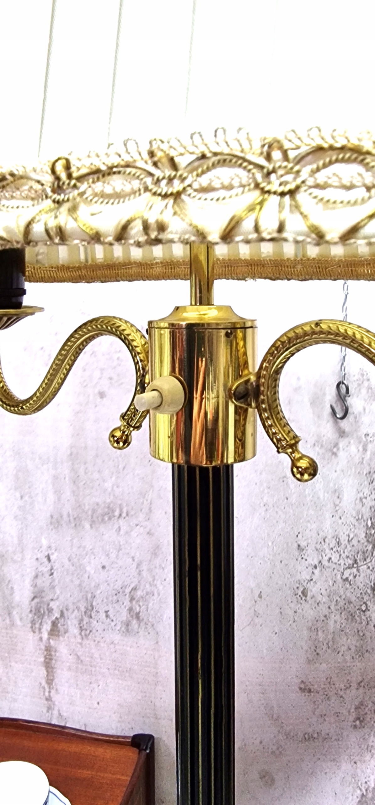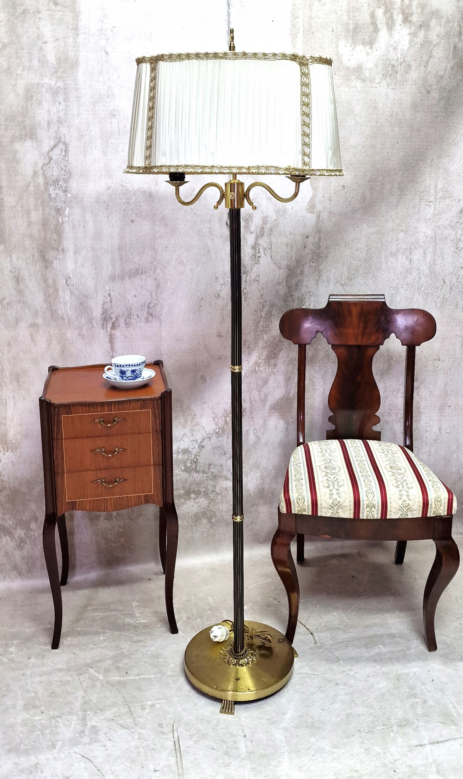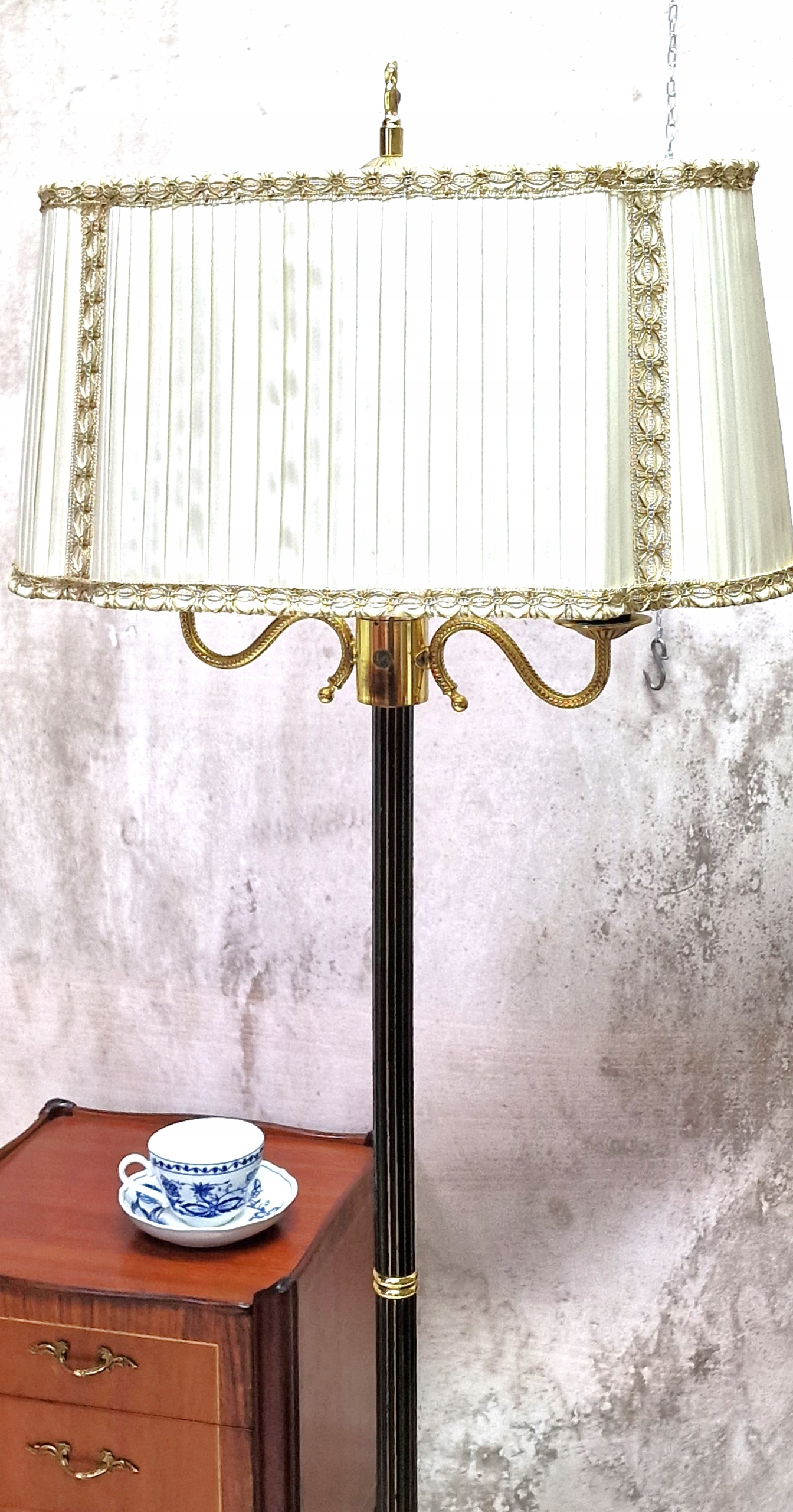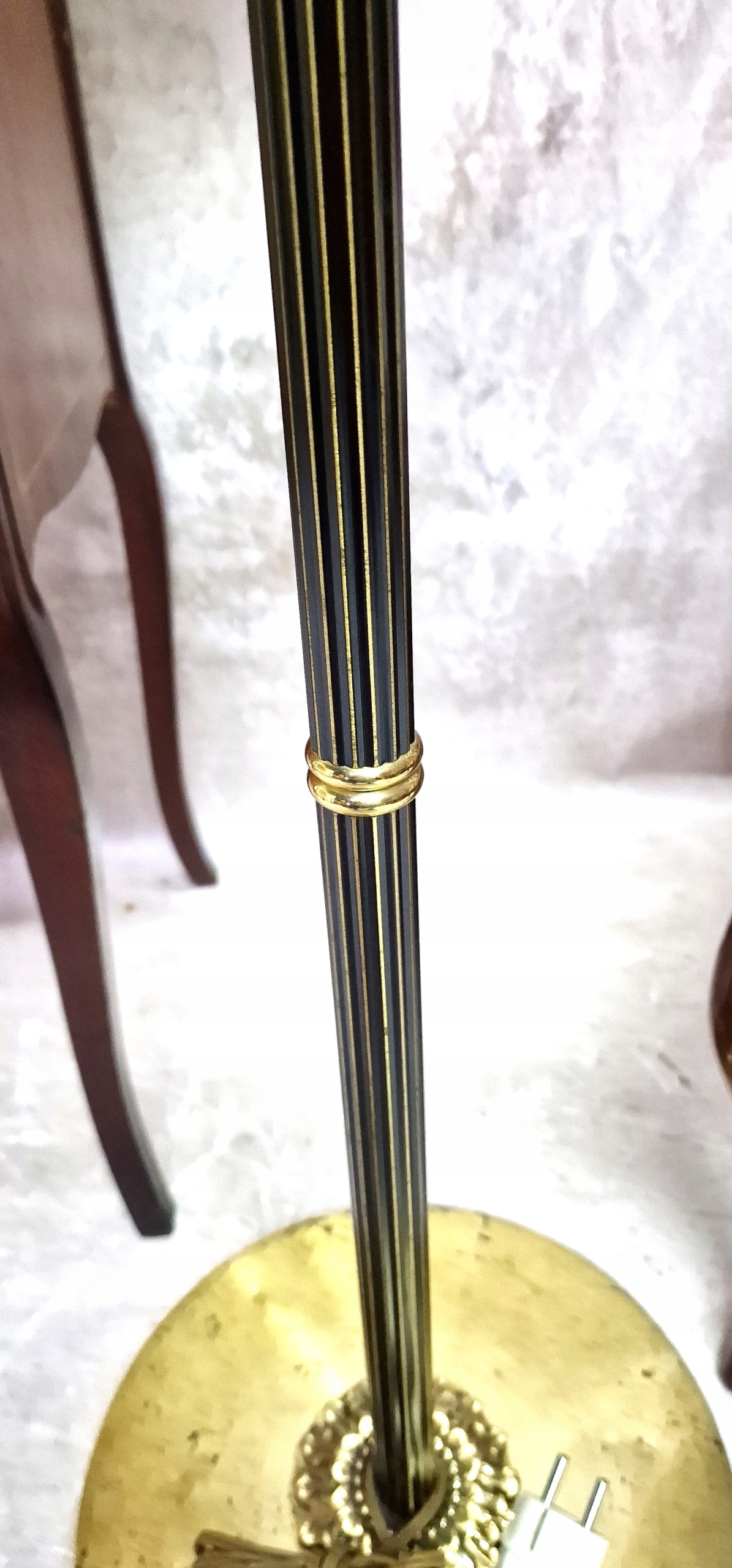 необычный латунный торшер с абажуром.