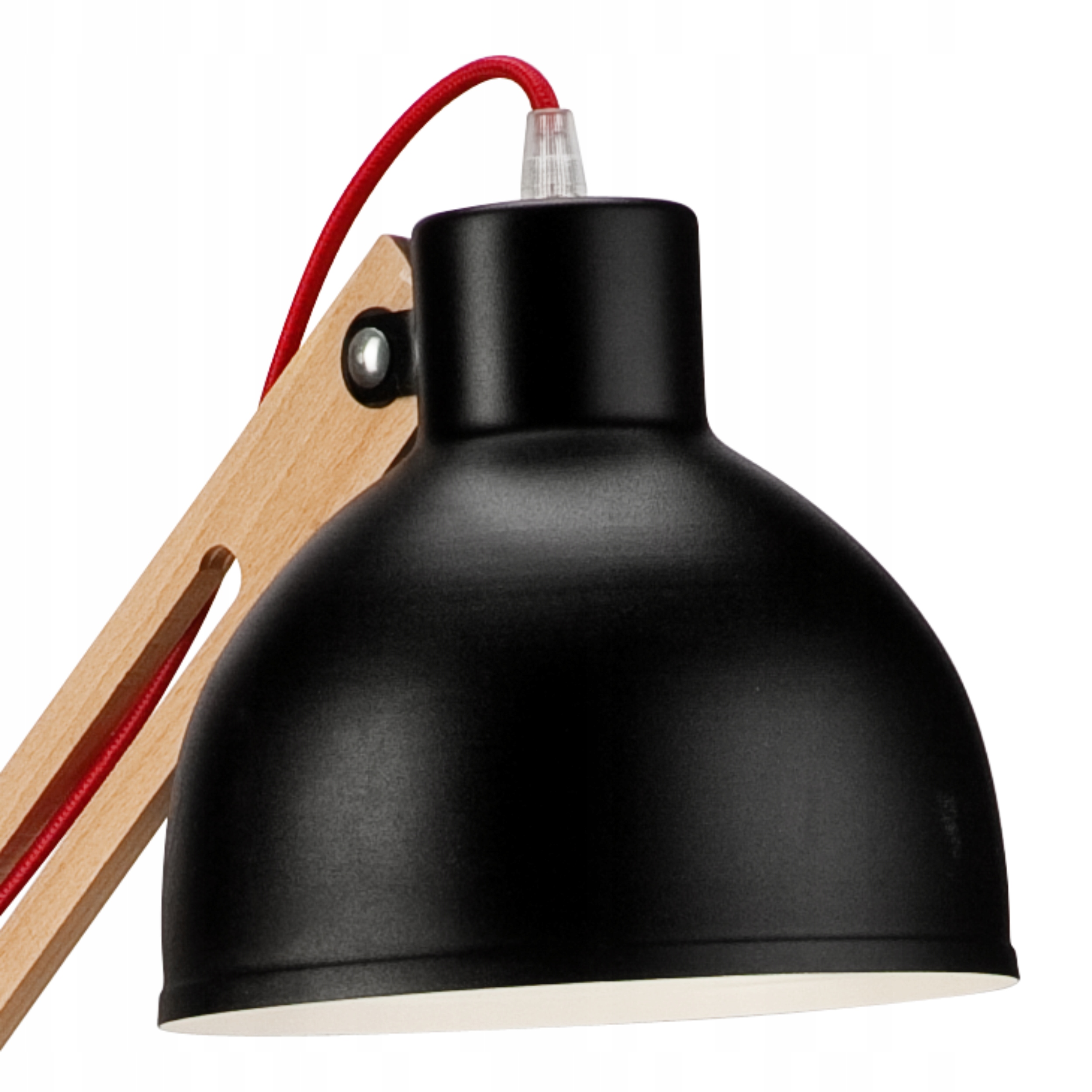 Внутренняя часть абажура покрыта белой матовой порошковой краской. Сквозь ажурный рукав эффектно проложен свободный силовой кабель с красной текстильной оплеткой.