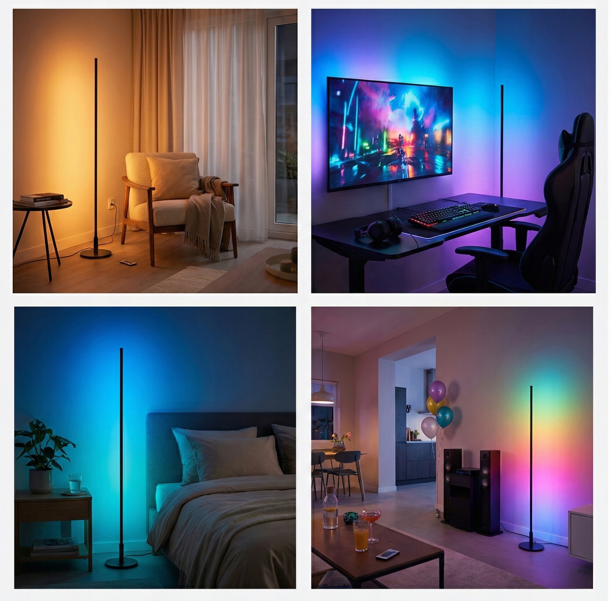 Благодаря высоте 142 см и минималистическому дизайну светильник идеально впишется в угол комнаты за телевизором или письменным столом. Создает так называемый эффект Ambilight, который оптически увеличивает экран, разгружает зрение и позволяет полностью погрузиться в цифровой мир.