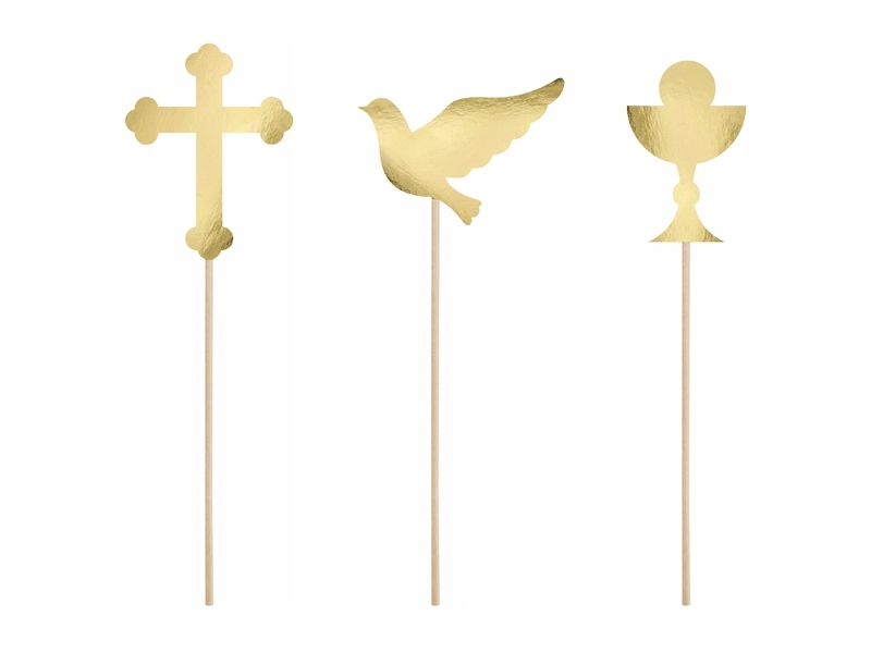 Топперы состоят из золотых зеркальных голубей, крестиков и чашечек, которые следует прикрепить к палочке и украшение для тортов, печенья и тортов готово. Также можно отказаться от палочек и приклеить только бумажные фигуры на розетки (есть на другом аукционе), коробочки, свечи и т.п.