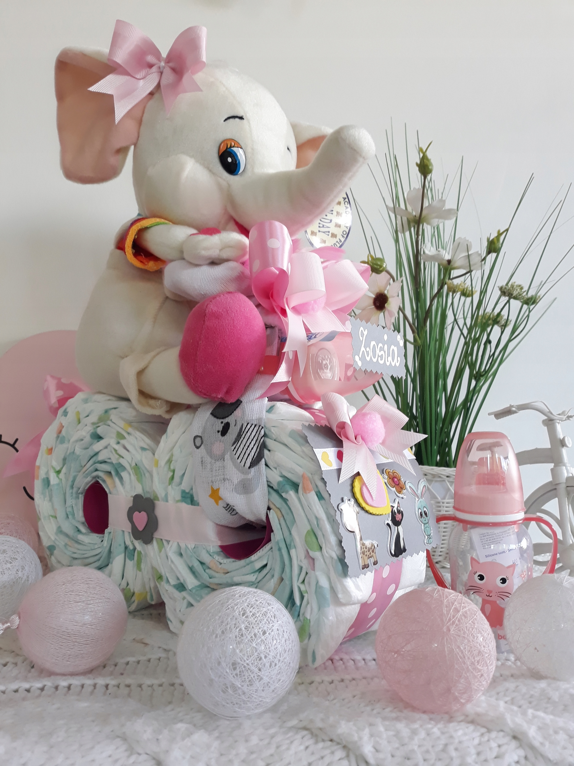 Красивый ВЕЛОСИПЕД из оригинальных подгузников PAMPERS 4 размера, с чудесным слоником ростом около 28 см от известной КОМПАНИИ SUN - DAY
