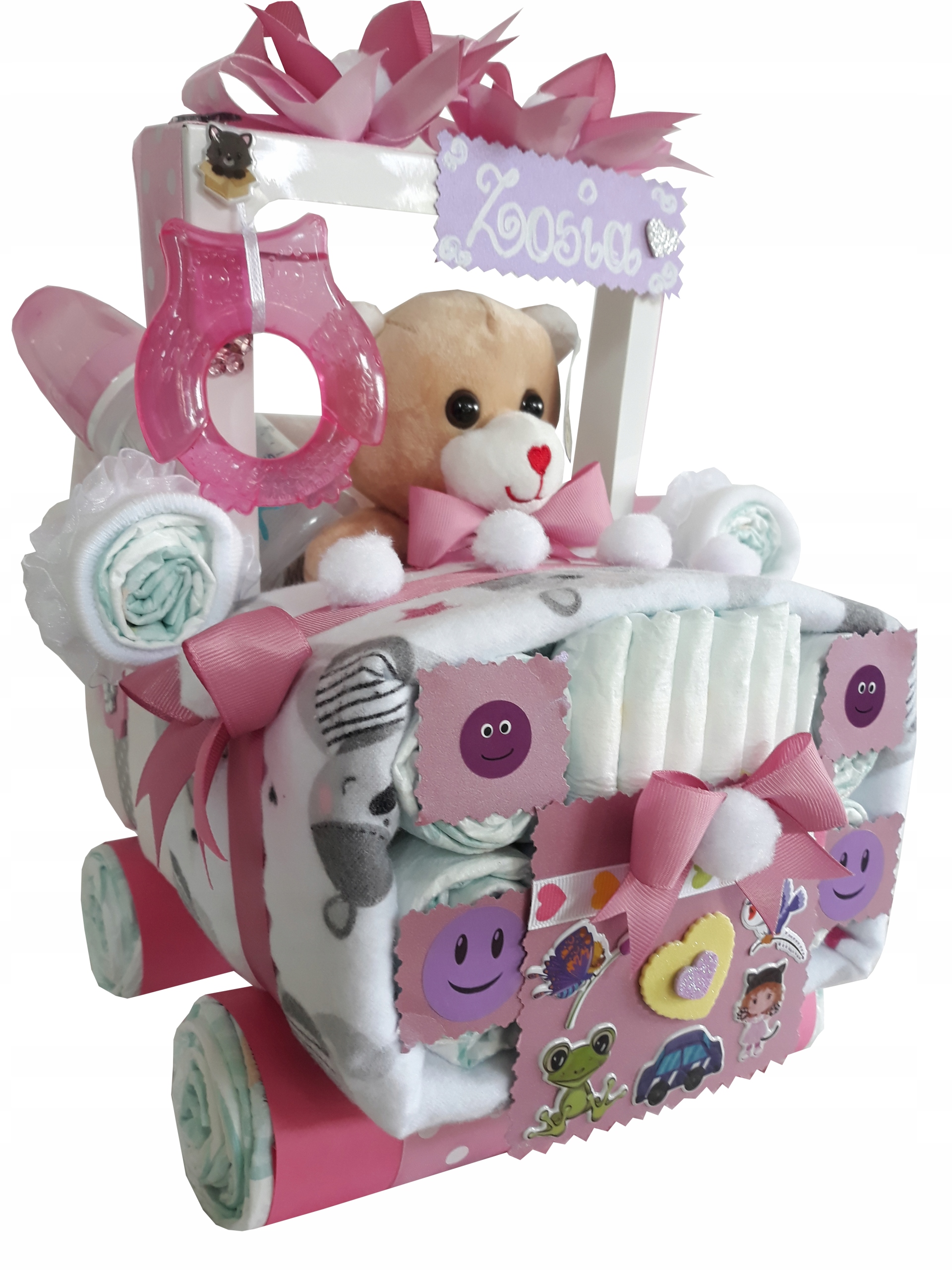 Красивая машинка из оригинальных подгузников PAMPERS 4 с чудесным мишкой, пледом от известной SUN-DAY COMPANY, прорезыватель и бутылочка от CANPOL, носки с рюшами.