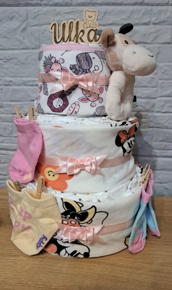 Уникальный торт с подгузниками - это практичный и эффективный подарок для недавно выпеченных родителей! Идеально подходит для детского душа, крещения или первых посещений ребенка.