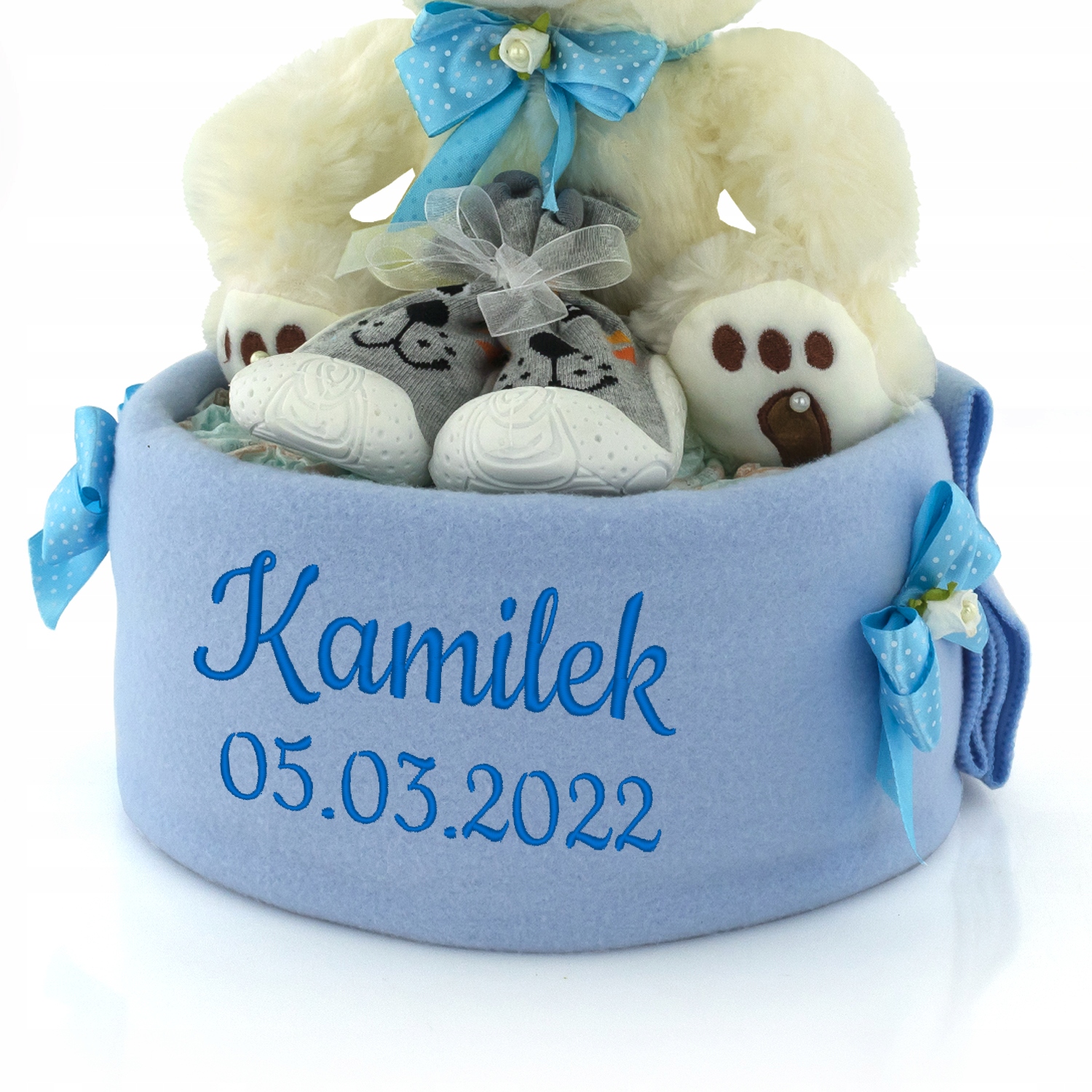 Торт из подгузников с талисманом и индивидуальной вышивкой - оригинальный и практичный подарок на рождение< /b >, крещение или день рождения ребенка. Подгузники складываются «тортом», вся вещь украшена дополнительными украшениями.