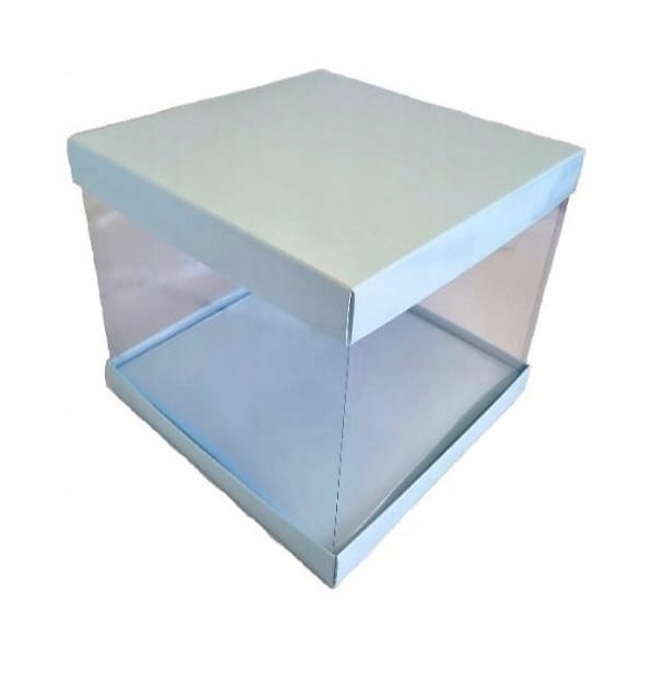 Упаковка для торта из пластика и картона. Коробка состоит из основания и крышки, выполненных из картона, и прозрачной пластиковой крышки.