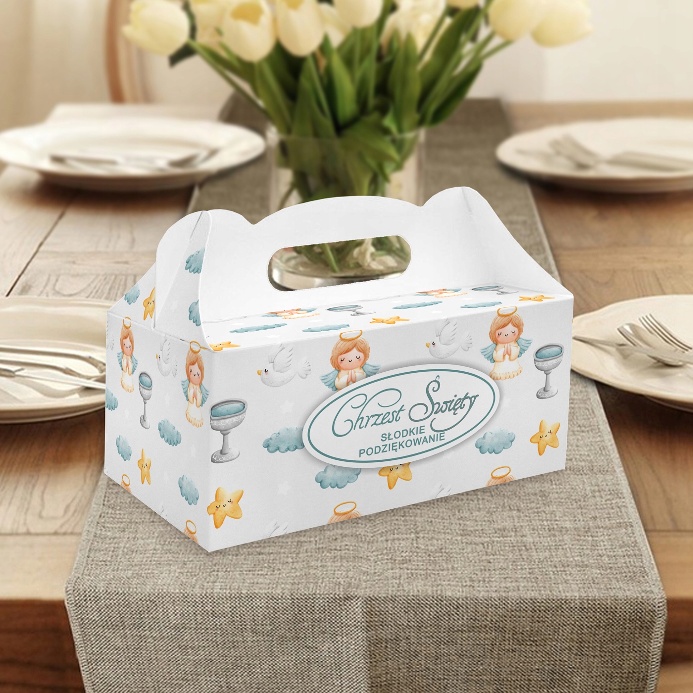 Коробка для торта, пирожного или других сладостей станет изящным способом отблагодарить гостей за то, что они пришли на Святое Крещение. Изготовлен из высококачественной бумаги с очаровательным принтом ангелочков, голубей и надписью «Святое Крещение, сладкая благодарность».