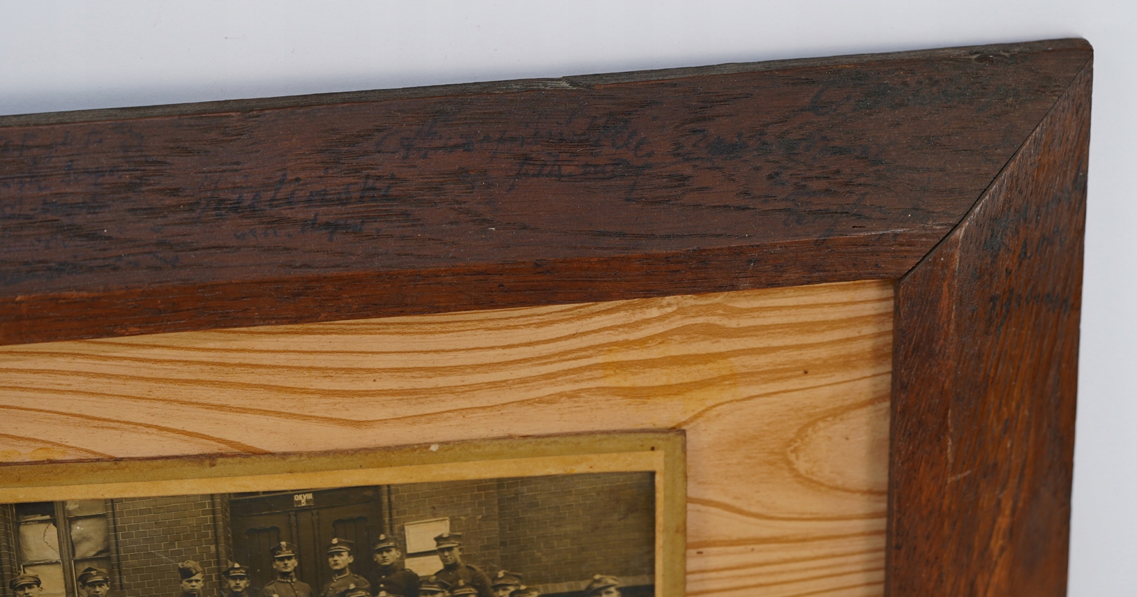 Оригинальная, чрезвычайно редкая довоенная военная фотография, единственный экземпляр, Сержантская школа менеджмента ТОРУНЬ. ОЖГ VIII 1922 г., фото Я. Мельницкого Торуня, фотография в оригинальной деревянной рамке, на рамке Оригинальные подписи солдат с именами, выполненными тушью, в нижней части рамки Оригинальная латунная табличка с посвящением: «В знак благодарность выпускникам 1-й Школы мира унтер-офицеров 1922 года. Размер: общий формат 38 х 31 см, формат фотографии 18,5 х 13,5 см, состояние Хорошее+, паспарту, на которое вмонтировано фото, заменено. Чрезвычайно интересный редкий оригинальный предмет. Состояние Прекрасно видно на фотографиях в описании аукциона.