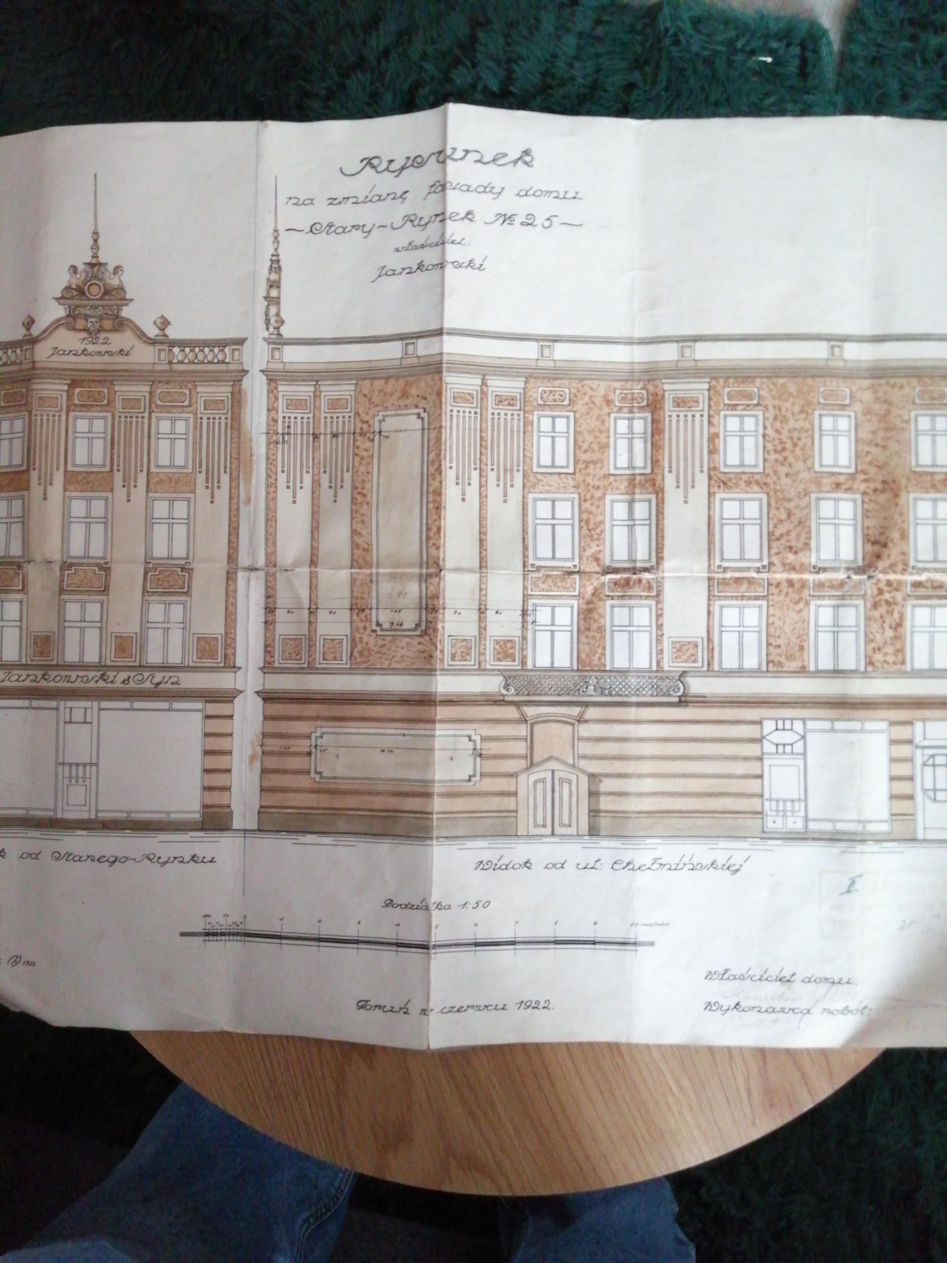 ОРИГИНАЛЬНЫЙ ЧЕРТЕЖ РУЧНОЙ РАБОТЫ ДЛЯ ИЗМЕНЕНИЯ ФАСАДА ДОМА СТАРЫЙ РЫНЕК №1. 25 - ВЛАДЕЛЕЦ ЯНКОВСКИЙ И СЫН.