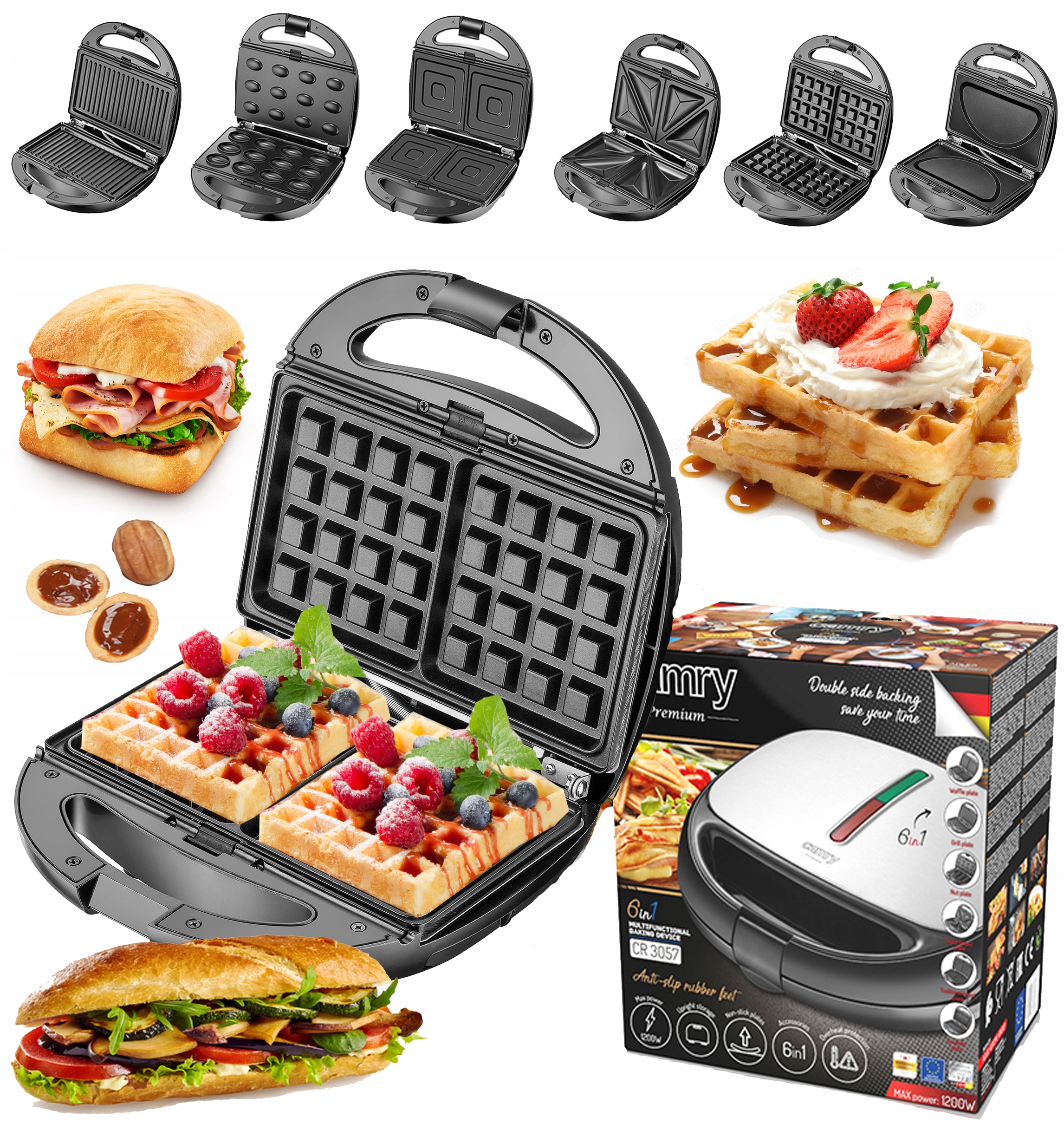 У Camry 3057 целых шесть функций в одном устройстве! Благодаря высокой мощности 1200 Вт устройство позволяет не только поджаривать сэндвичи, но и готовить пищу на гриле с двух сторон, выпекать хрустящие вафли и «ореховое» печенье. Устройство оснащено 6 типами сменных пластин: для сэндвичей с тостовым хлебом (пластина с треугольниками для более тонких сэндвичей), для традиционных сэндвичей с хлебом ( пластина с квадратными углублениями для более толстых сэндвичей), для гриля (плита с продольными бороздками), для вафель (клетчатая пластина), для арахисового печенья" (тарелка с желобками для тестовых шариков), для омлетов (тарелка с круглым вырезом)