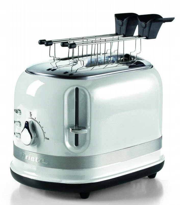 Тостер мощностью 820 Вт, с 6-ступенчатой регулировкой времени поджаривания, функцией нагрева, размораживания и прерывания, центрированием тостов, рамкой для поджаривания сэндвичей, термоизолированным металлическим корпусом, выдвижным поддоном для крошек.