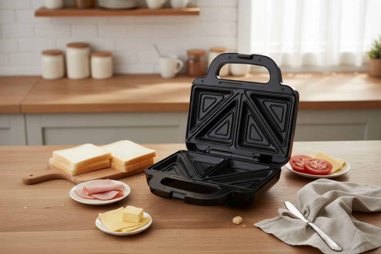 Пластины делят хлеб на четыре симметричных треугольника, которые равномерно поджариваются. Это способ приготовить удобные бутерброды, которые идеально подходят для работы, учебы или быстрого перекуса дома.