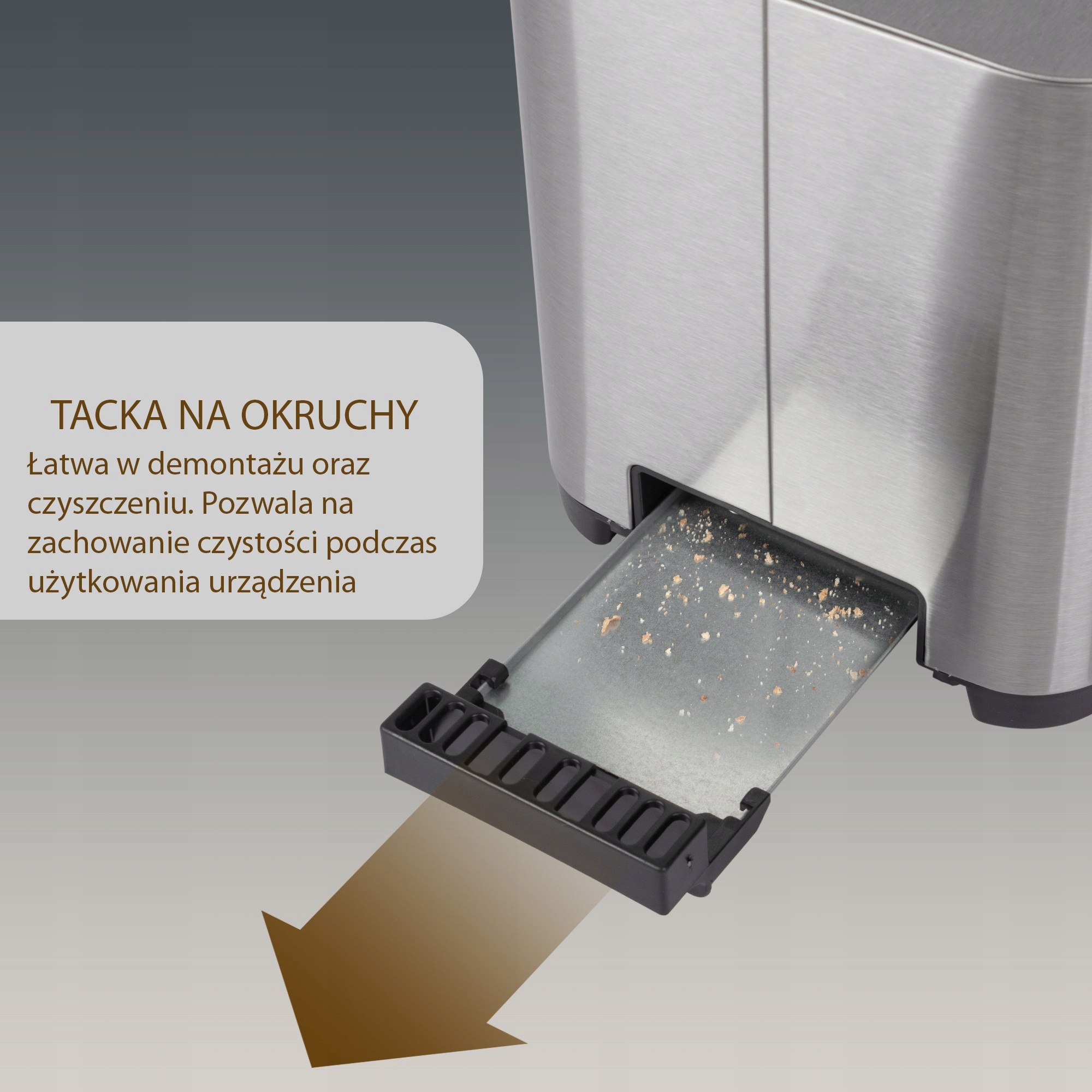 Максимальная мощность тостера составляет 850 Вт в зависимости от настроек. Для тостов и гренок предусмотрено 7 уровней поджаривания. Устройство выключается автоматически, но вы также можетесделать это вручную. Благодаря технологии распределения тепла внутри тост будет равномерно подрумяненным и хрустящим. Тостер имеетзащиту от перегрева.
