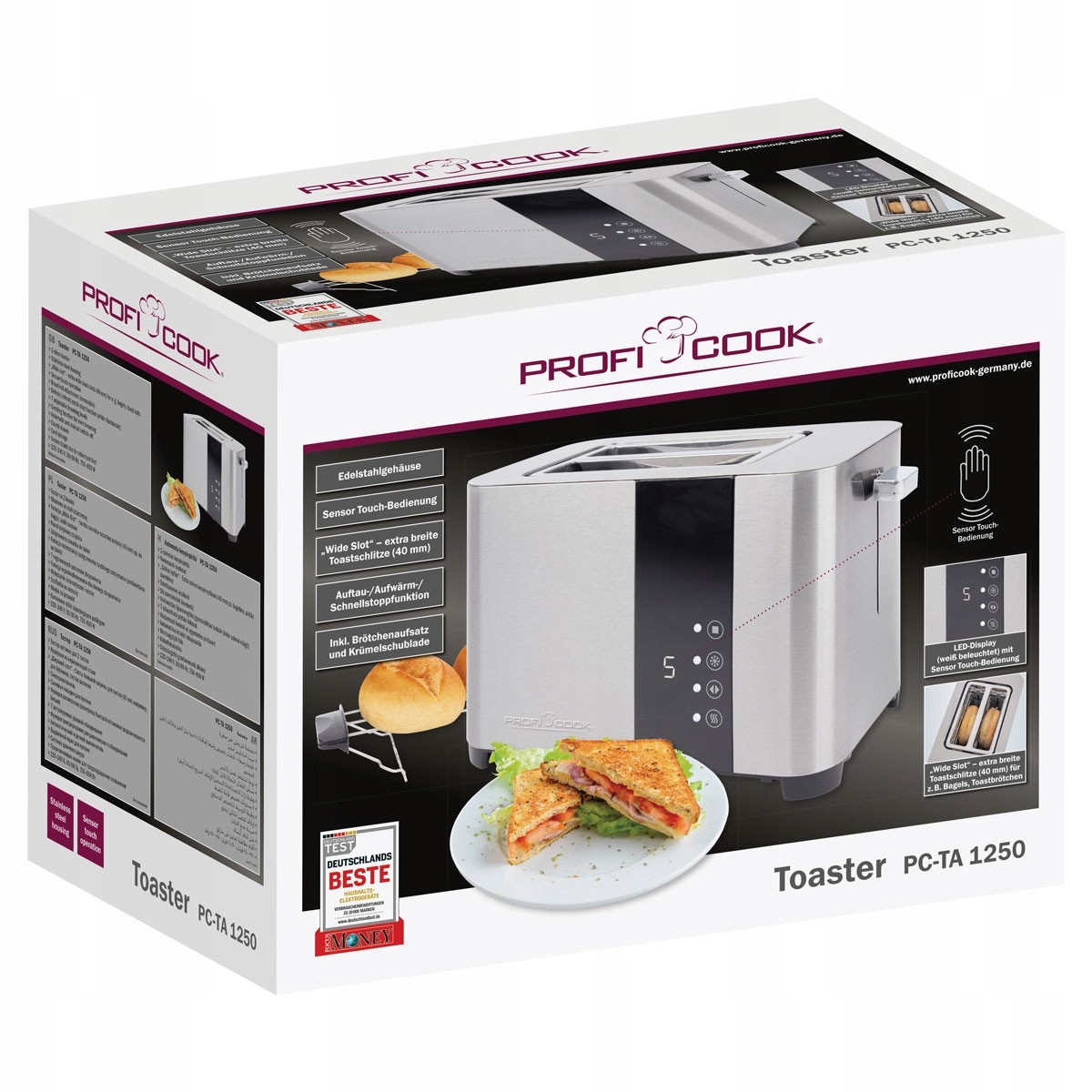 ProfiCook PC-TA — устройство, необходимое для приготовления вкусных, хрустящих тостов и гренок. Корпус выполнен из нержавеющей стали, управление осуществляется через современную сенсорную панель с подсветкой. Благодаря этому вы можете выбрать действие, которое хотите выполнить: разморозка, нагрев и быстрая остановка. Широкиепрорези для ломтиков (до 4 см) адаптируются под поджаренный хлеб — благодаря этому вы можете приготовить, например, брускетту.