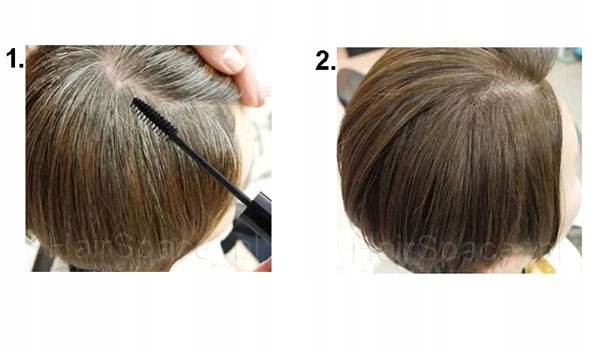 Второй аппликатор , напоминающая щеточку для туши, равномерно распределяет средство по волосам. Если седых волос немного, просто нанесите средство на волосы, используя только эту сторону косметики. Этот аппликатор имеет множество возможностей использования. Он также идеально подходит для маскировки отдельных седых волосков, появляющихся на бровях, а также на подбородке или волосах на лице.