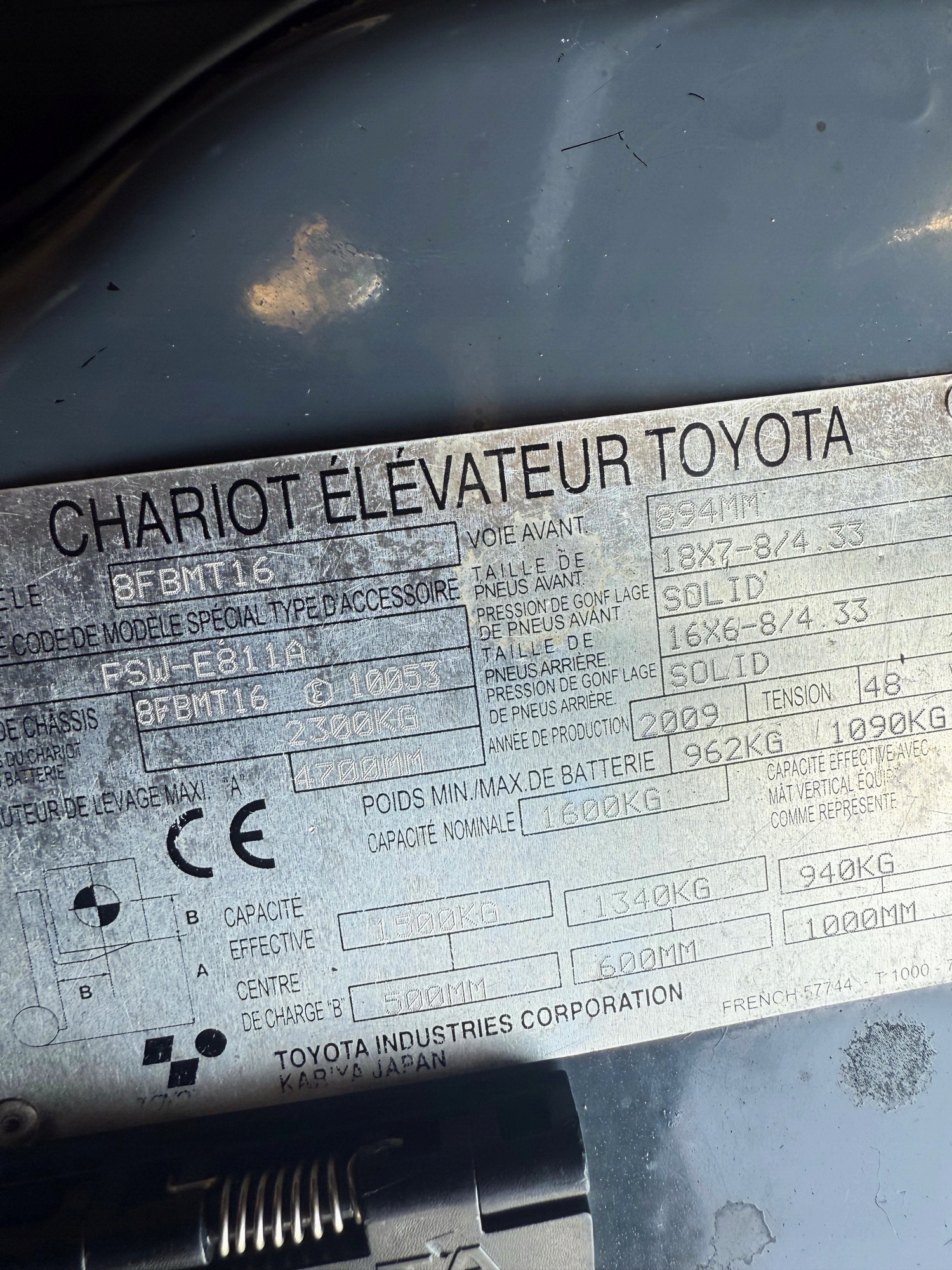 Electric forklift  h1>  Toyota 8FBMT16  h1>  Year of production 2009  H2>  Lifting of 1600kg  H2>  Lifting height 4.70m - Mast Triplex  h2>