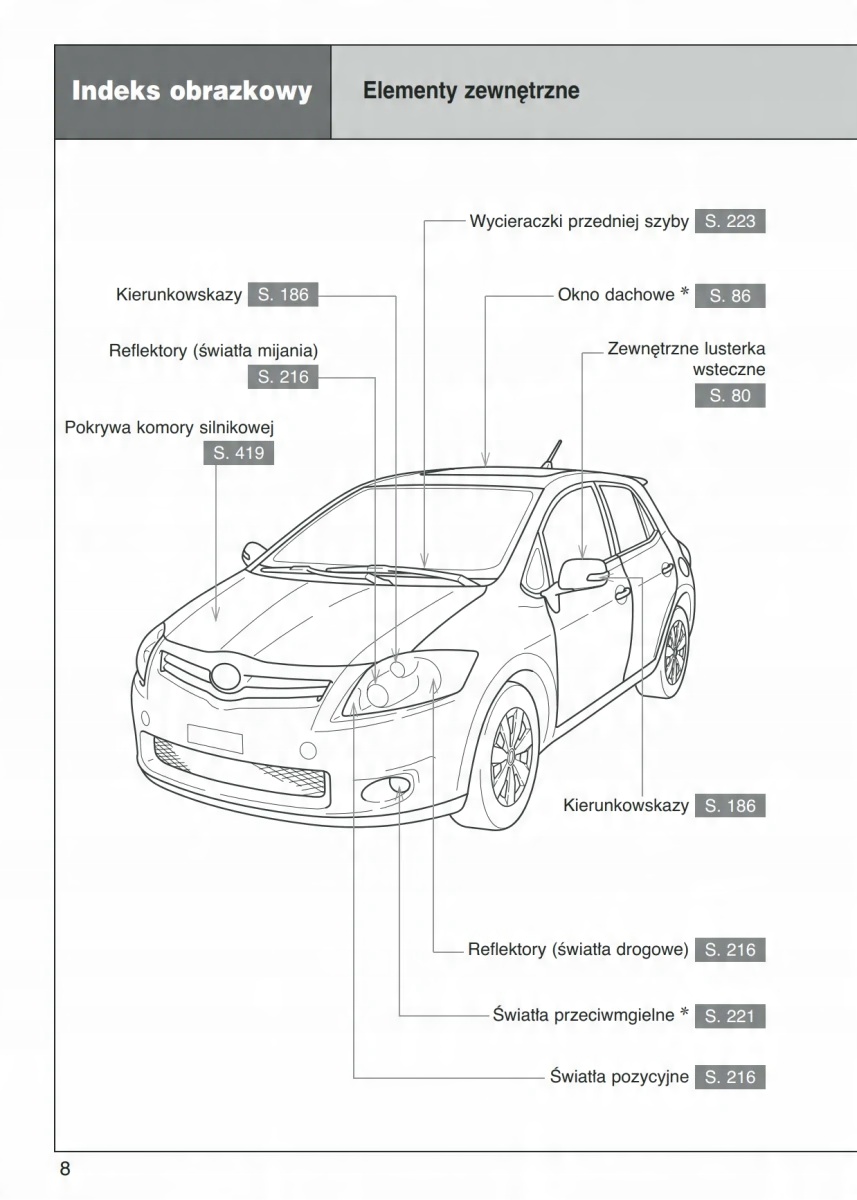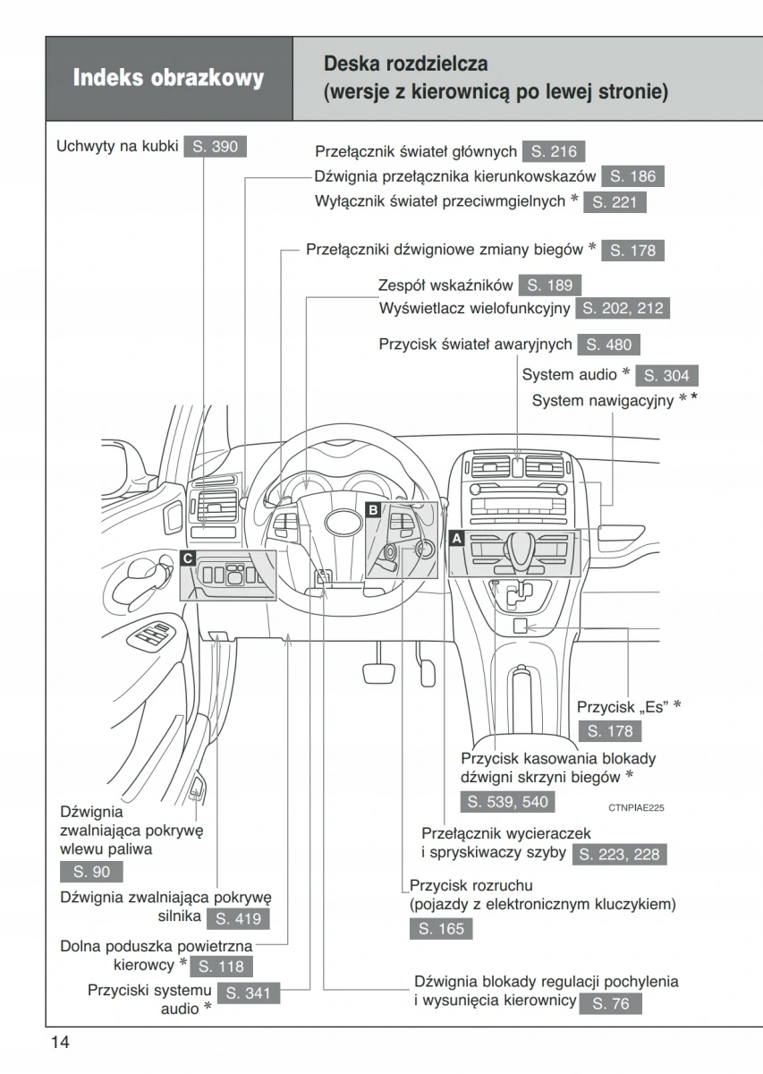 Руководство для владельца Toyota содержит все версии оборудования и полезную информацию о том, как эффективно и безопасно использовать автомобиль, например: индикаторы, контрольные лампы открытия и закрытия, освещение и видимость, сиденья, отсеки для хранения вещей, отопление, вентиляцию, кондиционер. - советы по вождению, эксплуатации, техническому обслуживанию автомобиля - уровни жидкостей, проверка и доливка, аварийные операции, замена колес, предохранителей, замена лампочек - технические данные... и многое-многое другое, что дает ощущение безопасность и комфорт для путешественников. Польское законодательство обязывает продавца приложить к автомобилю инструкцию на польском языке. Руководство пользователя автомобиля новое, на польском языке.