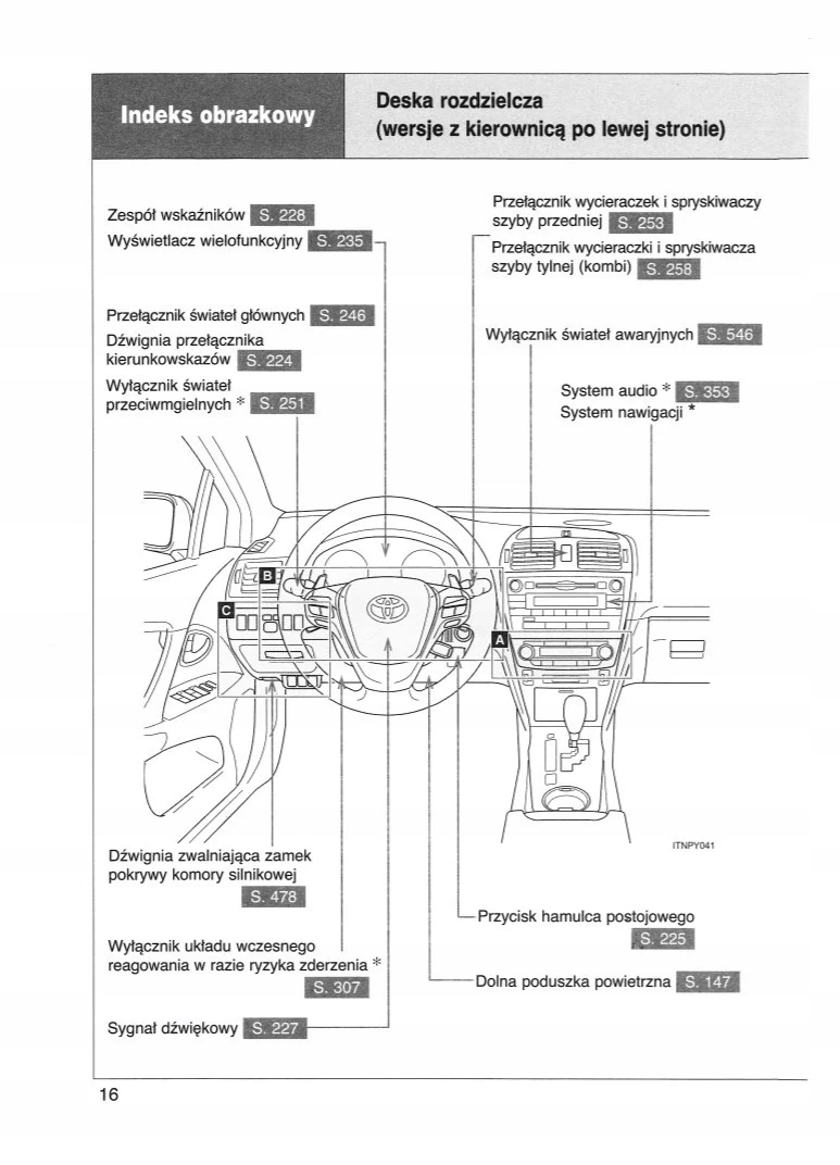 Руководство для владельца Toyota содержит все версии оборудования и полезную информацию о том, как эффективно и безопасно использовать автомобиль, например: индикаторы, контрольные лампы открытия и закрытия, освещение и видимость, сиденья, отсеки для хранения вещей, отопление, вентиляцию, кондиционер. - советы по вождению, эксплуатации, обслуживанию автомобиля - уровни жидкостей, проверка и доливка, аварийные операции, замена колес, предохранителей, замена лампочек - технические данные... и многое другое, что дает путешественникам ощущение безопасности и комфорта. обязывает продавца приложить к . Руководство пользователя автомобиля новое, на польском языке.