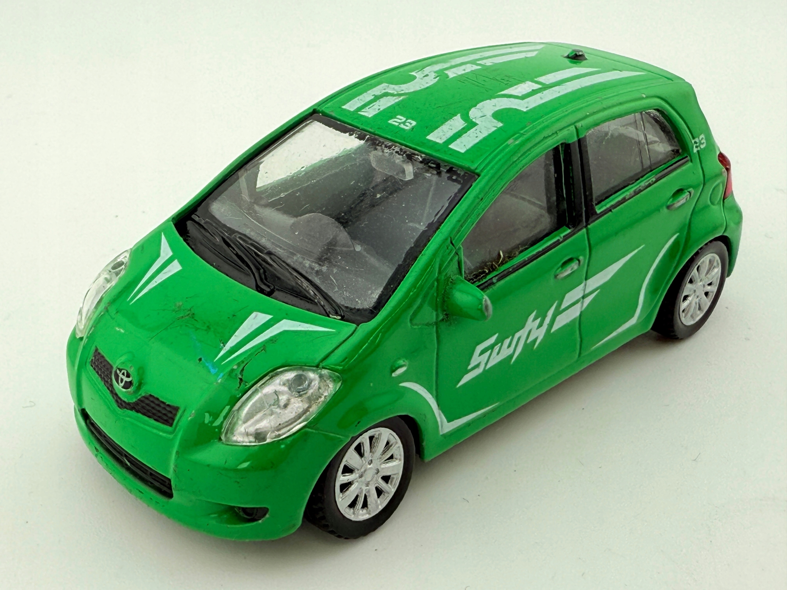 Модель основана на настоящей Toyota Yaris, популярном городском автомобиле. Его цвета относятся к спортивным стилизациям, что делает его привлекательным для фанатов гонок. Модель не принадлежит к конкретной тематической серии, но ее внешний вид предполагает, что она может быть частью спортивных коллекций автомобилей.