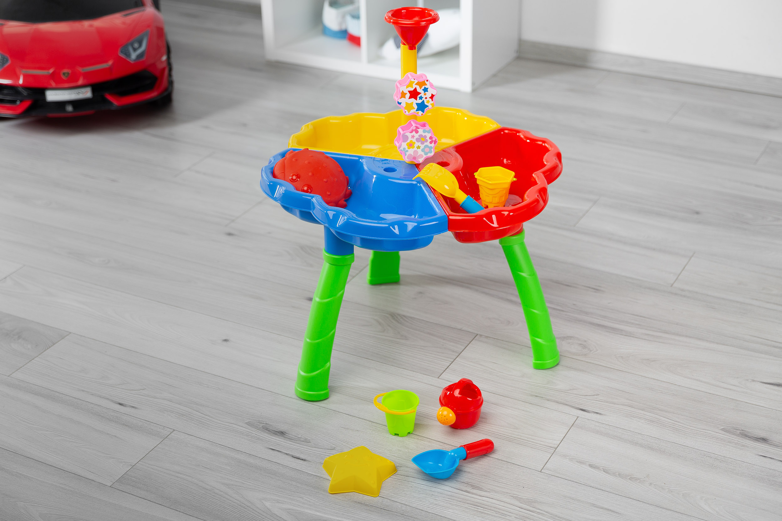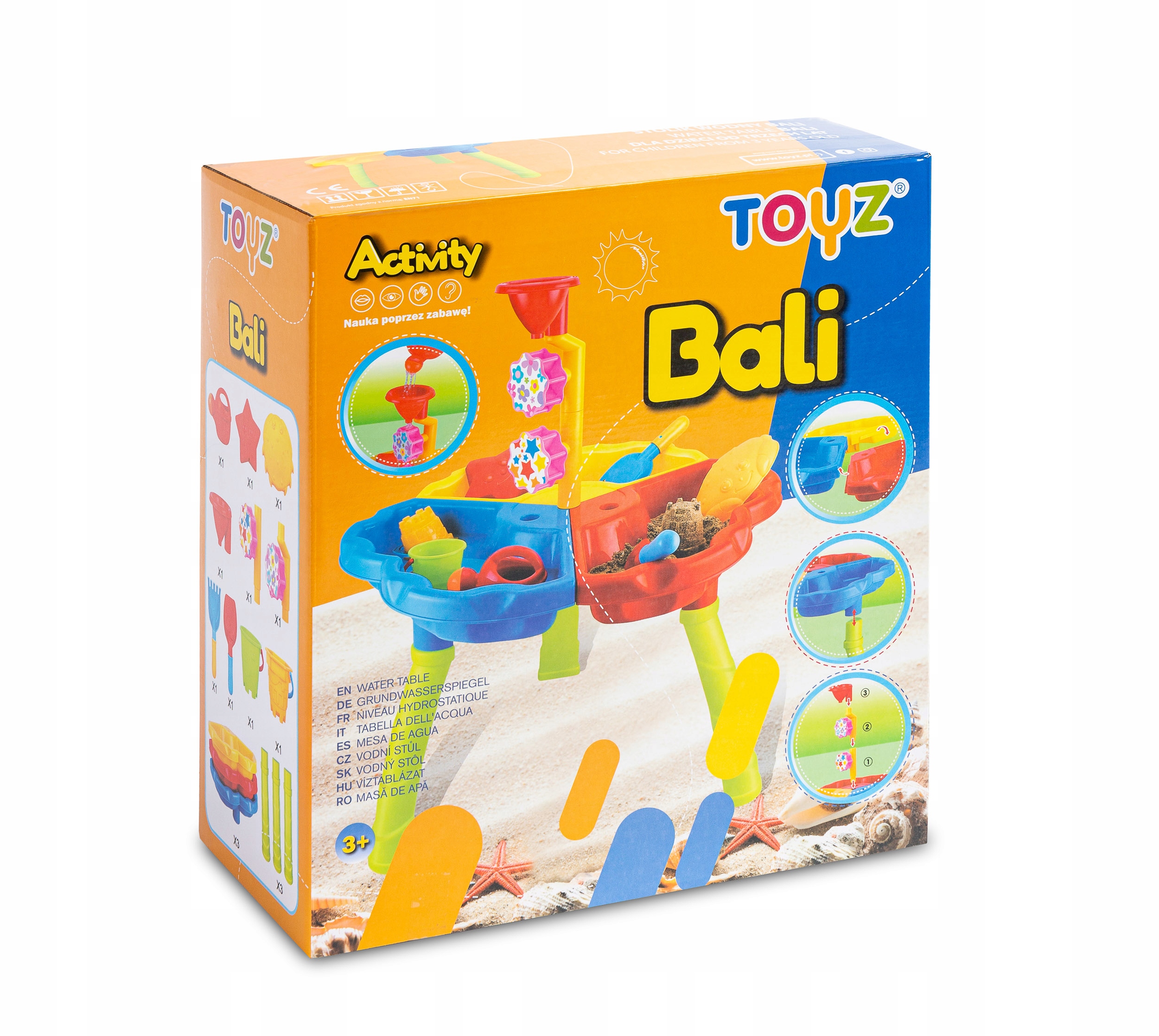Bali — развивающий стол из серии Toyz Activivy, идеально подходящий для игры дома, на балконе или в саду. Дети могут развивать свое любопытство к миру и играть с водой или песком. Богатый набор аксессуаров позволяет Бали надолго увлечь детей. В комплект входят: 2 большие формы (краб и звезда), лопата и грабли, 2 ведра, лейка и башня с катушками. После игры стол можно легко сложить и хранить в упаковке.