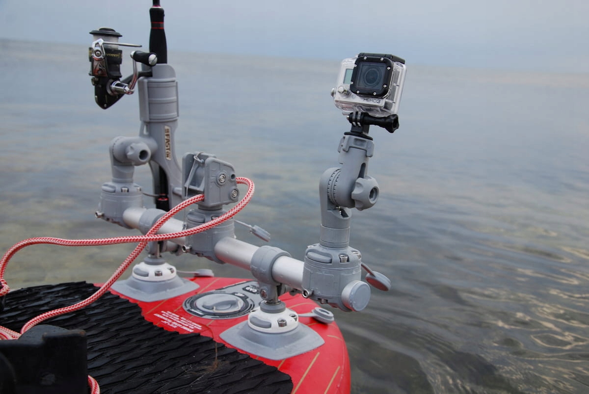 Адаптер имеет шарниры, позволяющие гибко расположить камеру или фонари.