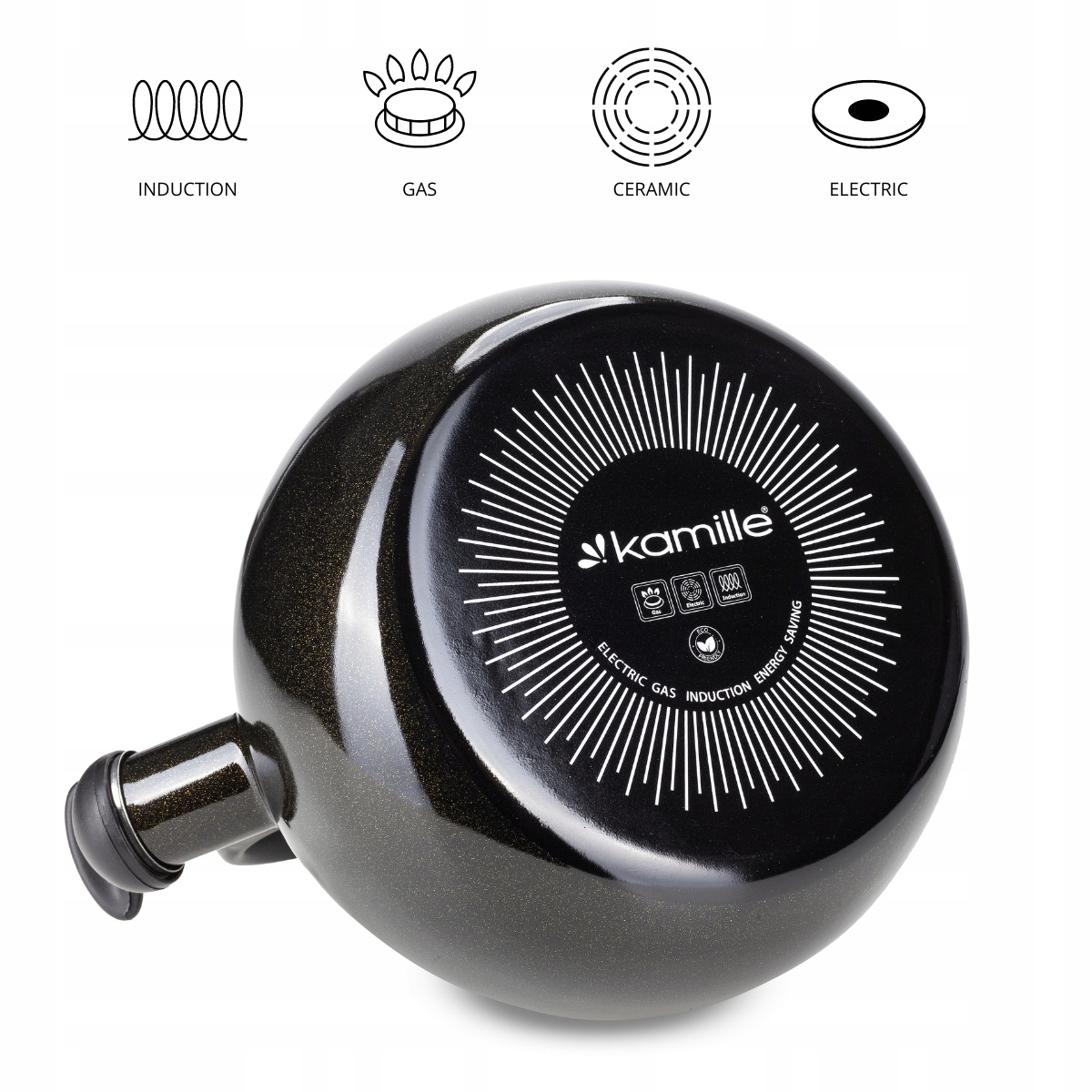 Kamille Kettle может использоваться на традиционной газовой плите, но также индукции, электрической и керамической, b>, так что он чрезвычайно универсален и работает почти на каждой кухне.