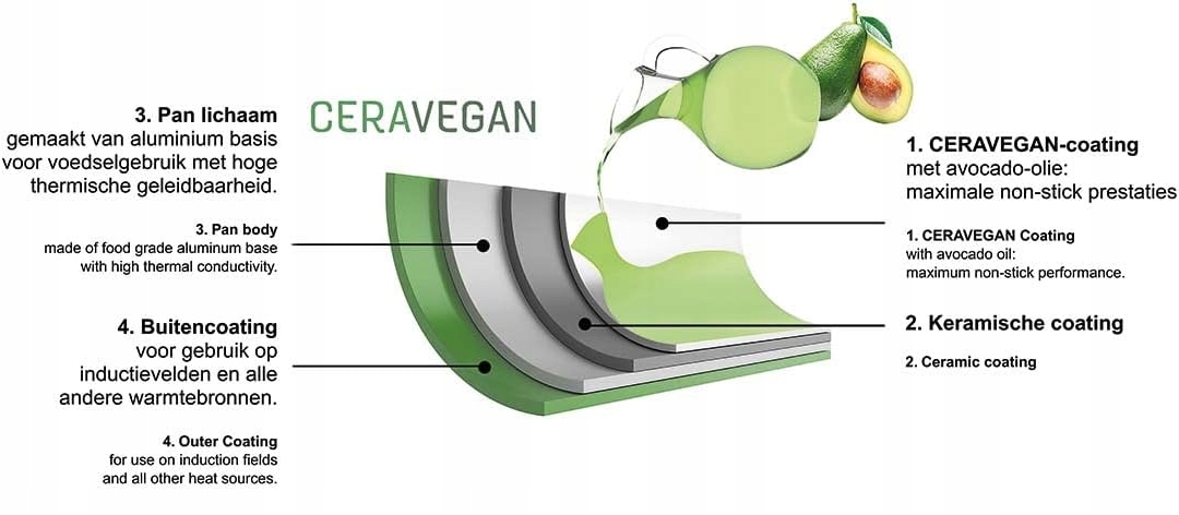 Покрытие состоит из нескольких слоев, верхний слой которых содержит смесь масла авокадо и воды. Не содержит химических растворителей. Прочнее, чем имеющиеся в продаже антипригарные покрытия, поскольку содержит натуральный антипригарный агент чисто растительного происхождения: масло авокадо, которое создает тонкую микропленку, повышающую антипригарные свойства покрытия. Чрезвычайно прочный, устойчивый к царапинам и долговечный. Изготовлен из высококачественного алюминия с антипригарным покрытием Ceravegan, основанием из нержавеющей стали и ручками с эффектом дерева. Идеально подходит для жарки. Ценные витамины и питательные вещества сохраняются. лучший вкус. Никакой запекания и склеивания. Подходит для духовок до 160°C.