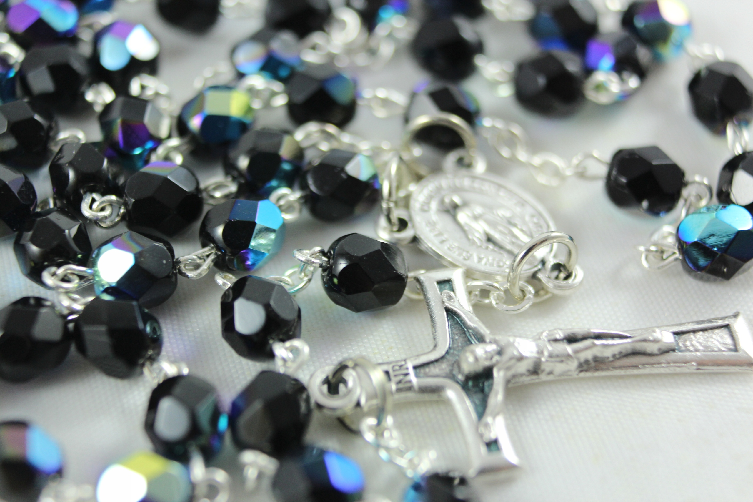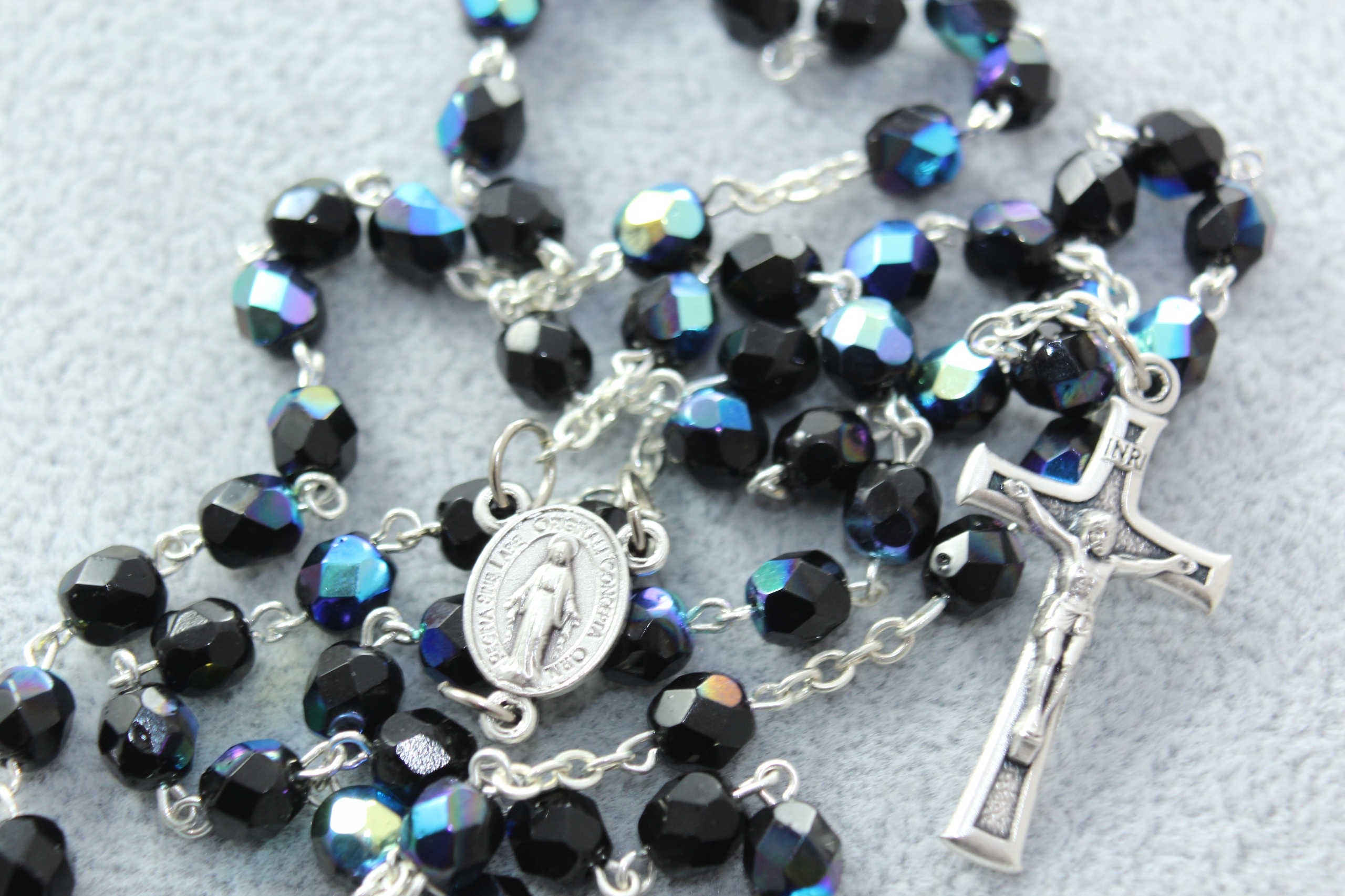 Красивые четки, сделанные вручную из темно-синих - опаловых кристаллов, с медалью Непорочного зачатия и Фатимским крестом.