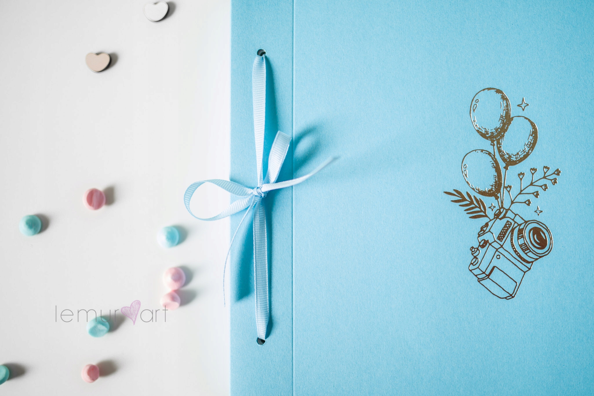 Альбом отличается синей обложкой и плотными белыми карточками, перевязанными элегантной лентой.