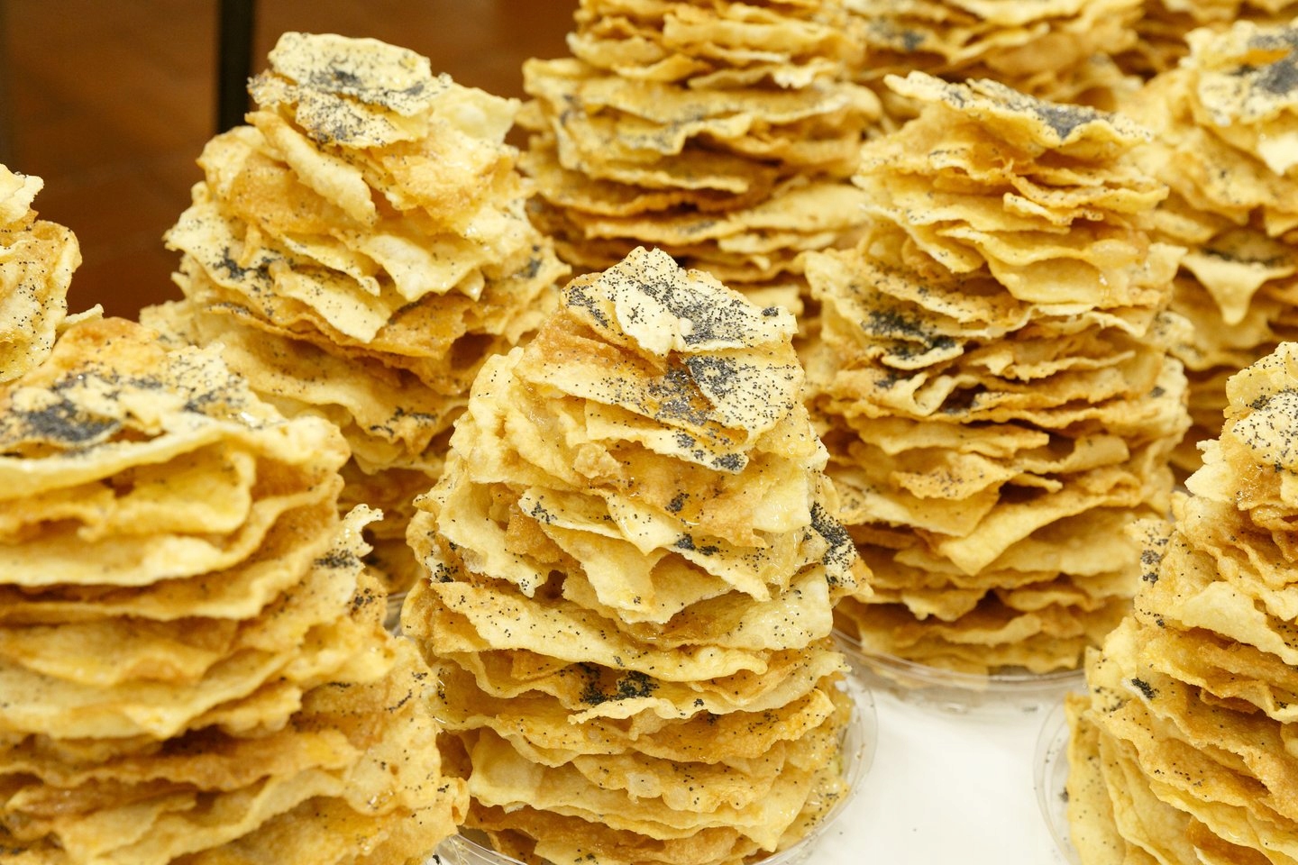 Это обжаренный во фритюре пирог-фаворк, сложенный в виде холмика из листов неправильной формы, сбрызнутых медом и посыпанных орехами, маком и изюмом.