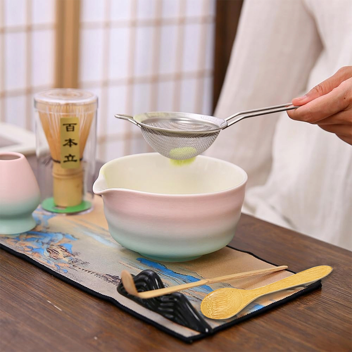 🌱🌱 Набор матча с метлой – набор из 8 предметов: миска для матча, бамбуковая метла для матча, ложки, сито и другие аксессуары. Идеальный стартовый набор для церемонии заваривания матча (розовый градиент)
