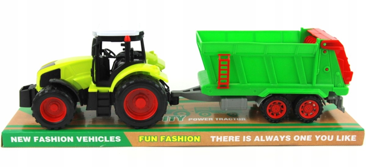Комплект состоит из зеленого трактора и прицепа с прикрепленным к нему навозоразбрасывателем.