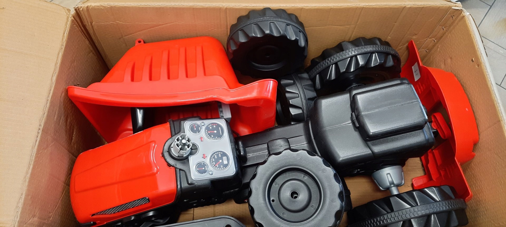 Педальный трактор Огромный большой с прицепом из красной катушки h1> Трактор имеет незначительные ссадины и царапины. Это не использовалось. Пронзительный картон. Перелом зацепления оси в трейлере. h2> Дефекты продукта, видимые на картинках. H2>
