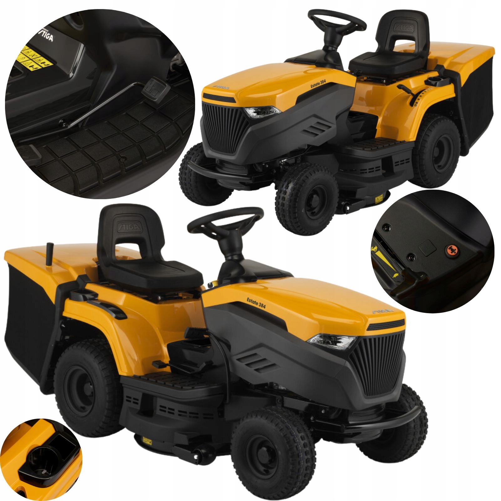 STIGA Estate 384 оснащен двигателем внутреннего сгорания STIGA полезной мощностью 6,8 кВт при 2400 об/мин. Трактор оснащен гидростатической трансмиссией с ножным управлением, которая позволяет контролировать скорость движения без переключения передач. Дена косилки 84 см и 2 лезвия. Можно установить 1 из 7 значений высоты стрижки в диапазоне от 25 до 80 мм. Трактор также оснащен удобной электромагнитной муфтой переключения ножей, управление которой осуществляется одной кнопкой. Косилка Estate 384 оснащена травосборником объемом 240 литров и может использоваться с функцией STIGA Multiclip. Погрузчик STIGA и мульчирующая насадка продаются отдельно. Эргономичное рулевое колесо STIGA сочетается с регулируемым сиденьем STIGA Classic с высокой спинкой, обеспечивая комфорт вождения.