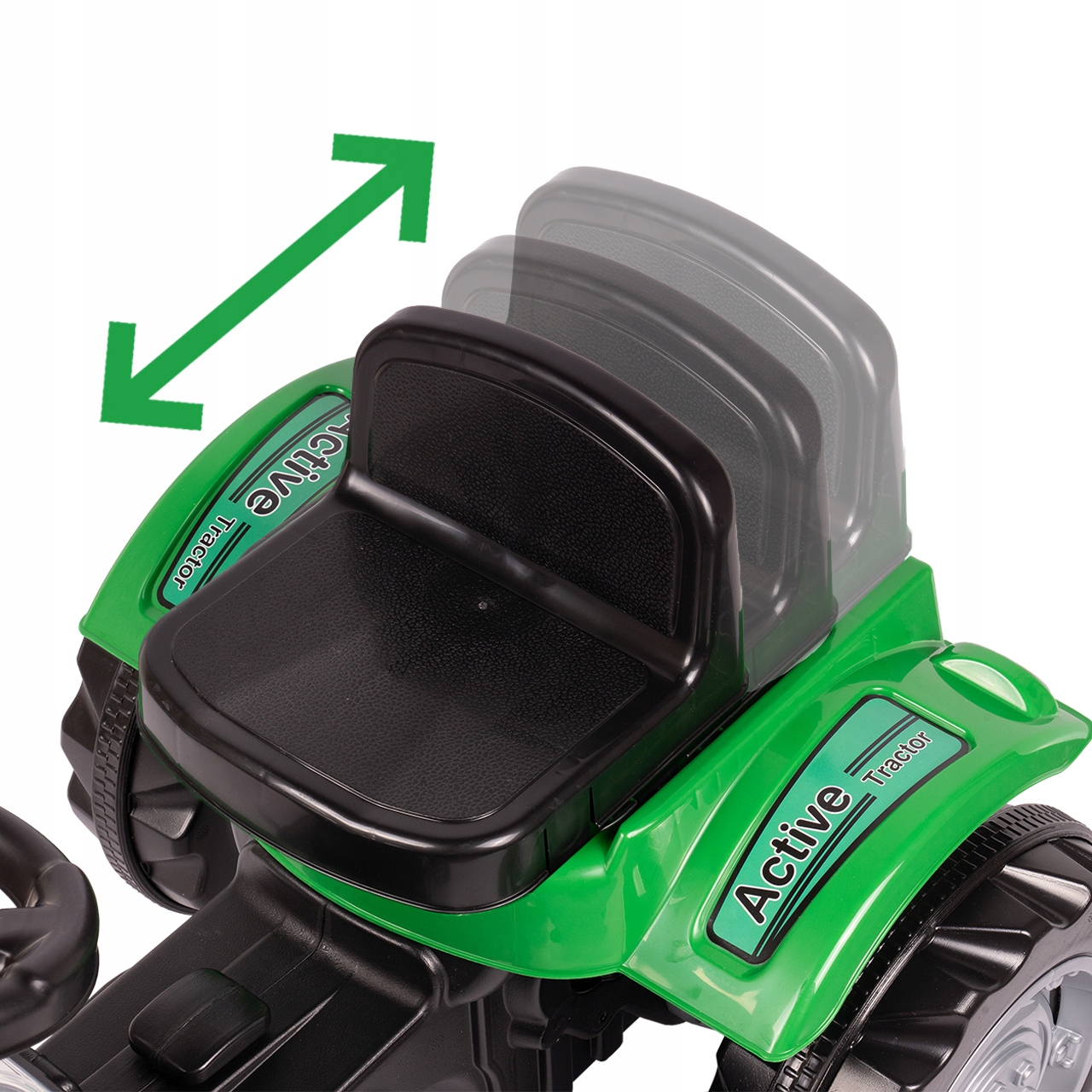 Трактор оснащен удобным седлом с регулировкой положения, что позволяет легко настроить трактор под рост вашего ребенка. Такое решение позволяет пользоваться транспортным средством долгие годы и быть уверенным, что ваш ребенок скоро его перерастет