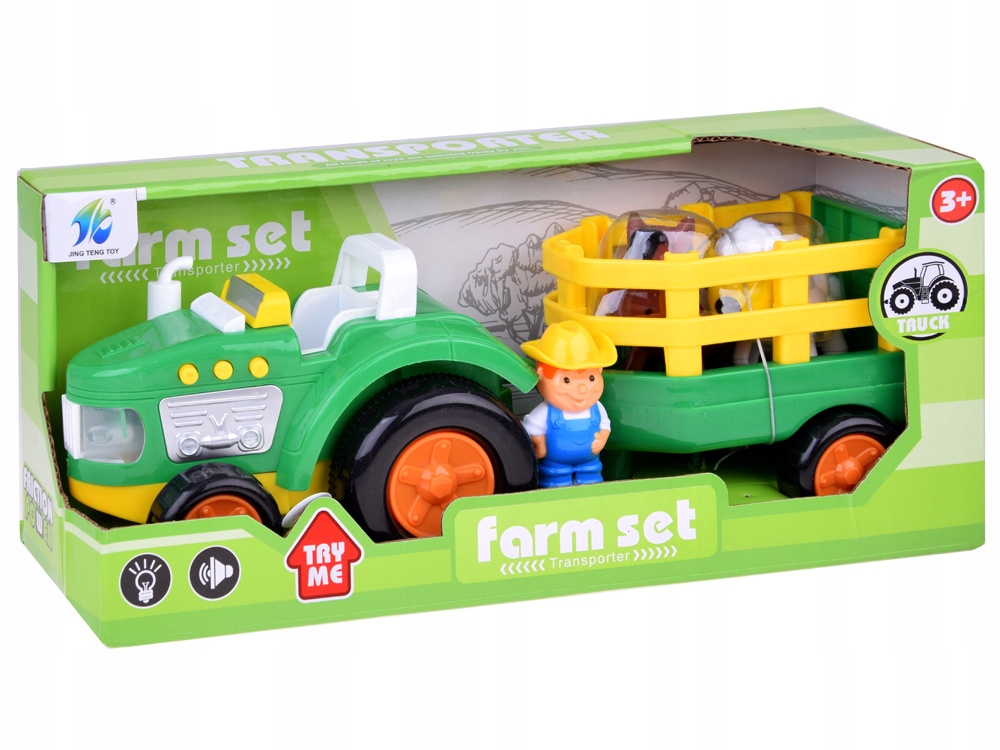 Игрушка – идеальный способ развить воображение вашего ребенка! Зелено-желтый трактор с реалистичными деталями и движущимися колесами подарит часы увлекательного веселья. Ребенок может сыграть роль маленького фермера, позаботиться о своих животных – лошади и овце – и перевезти их в открывающемся трейлере. Легкоснимаемая фигурка фермера в желтой шляпе дополнительно разнообразит игровые сценарии.