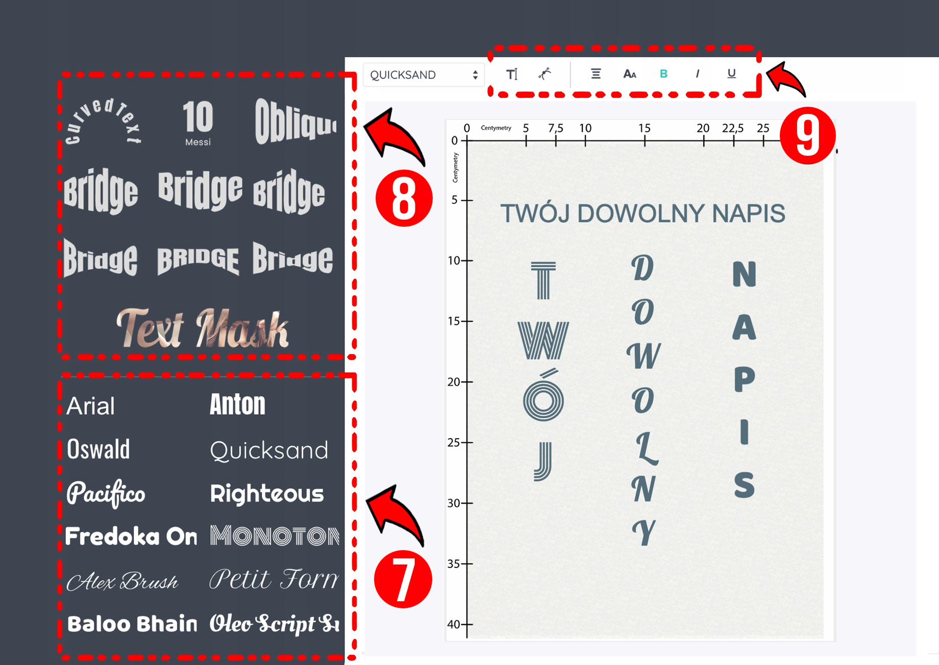 9️⃣ (9) - Разумеется, базовые функции, такие как изменение цвета текста, выделение жирным шрифтом, курсив, подчеркивание, изменение одной кнопкой мыши с заглавных букв на строчные. и наоборот, а менять интервал и другие параметры надписей можно одной кнопкой мыши. Очень важно, чтобы в нашем редакторе все шрифты были польскими символами (ą,ę,ź,ć,ó)