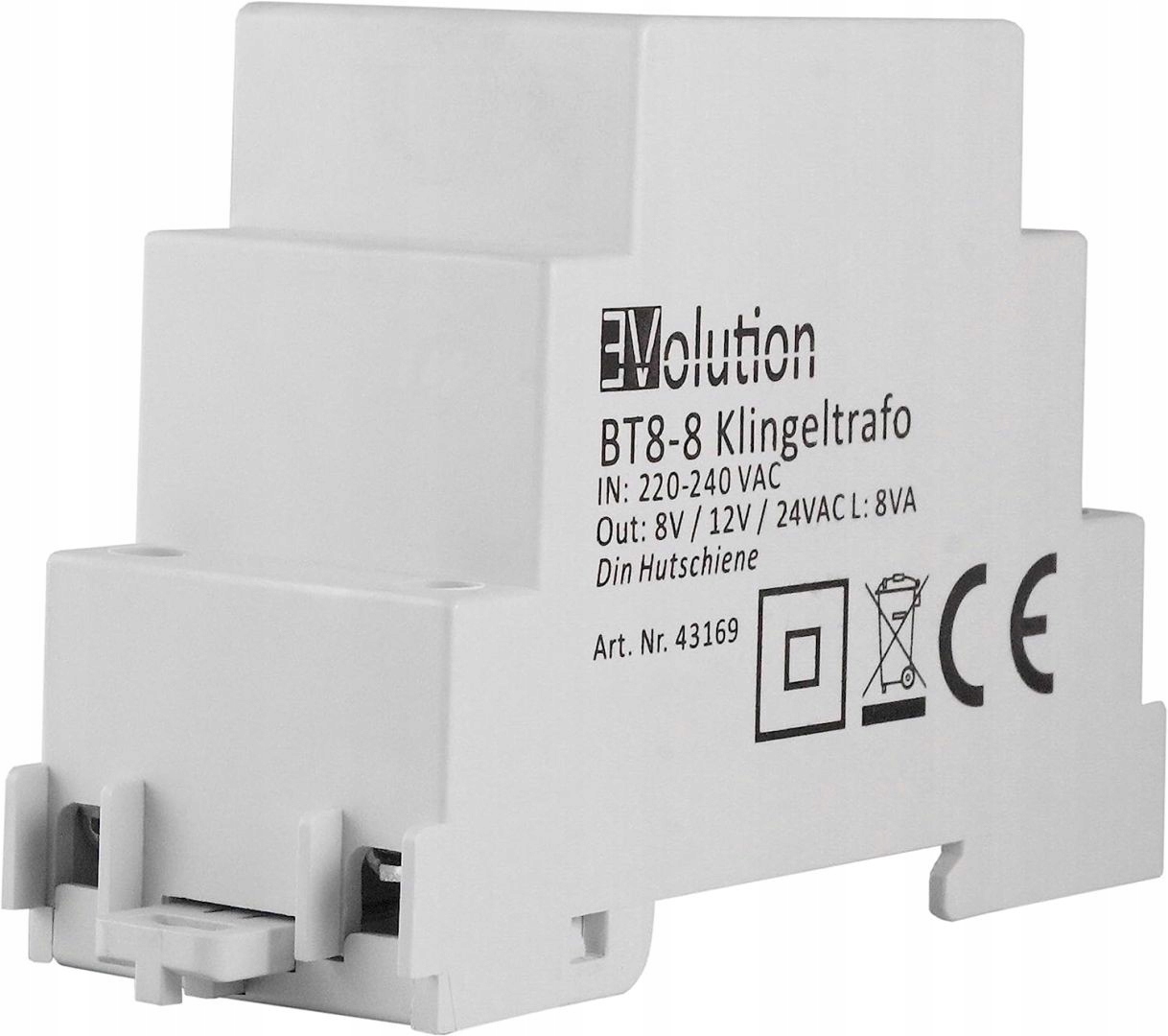 Трансформатор дверного звонка Evolution BT8-8 имеет прочную и надежную технологию с кольцевым сердечником, обеспечивающую надежную работу. Легко монтируется на ваучеры DIN, например, у дистрибьюторов или субдистрибьюторов. Совместим с традиционными инженерными системами.