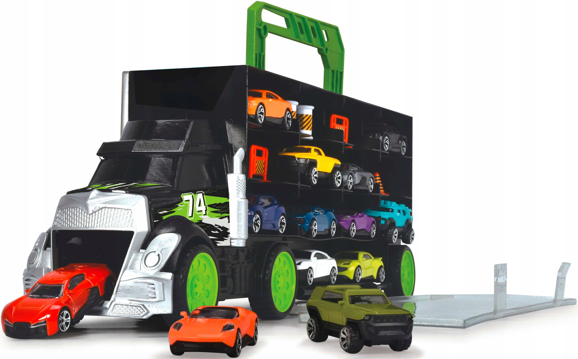 Truck, - удивительная идея подарка для каждого маленького автомобильного любовника. Transporter находится в Black с зелеными и серыми элементами , имеет движущиеся колеса, что позволяет ему двигаться по плоским поверхностям и -боковой системе, , что облегчает вставку и вытащить дороги или дорожные аксессуары