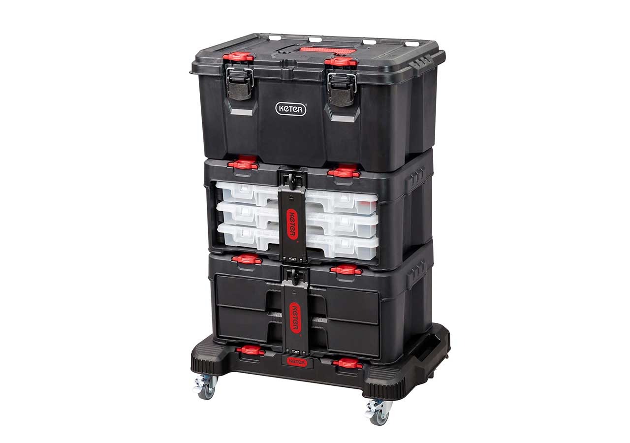 Транспортная платформа Keter Stack'N'Roll 2-в-1 — это инновационная мобильная тележка сочетающее в себе функции транспортной основы для ящиков для инструментов и удобного мастерского лотка с углублениями для инструментов.
