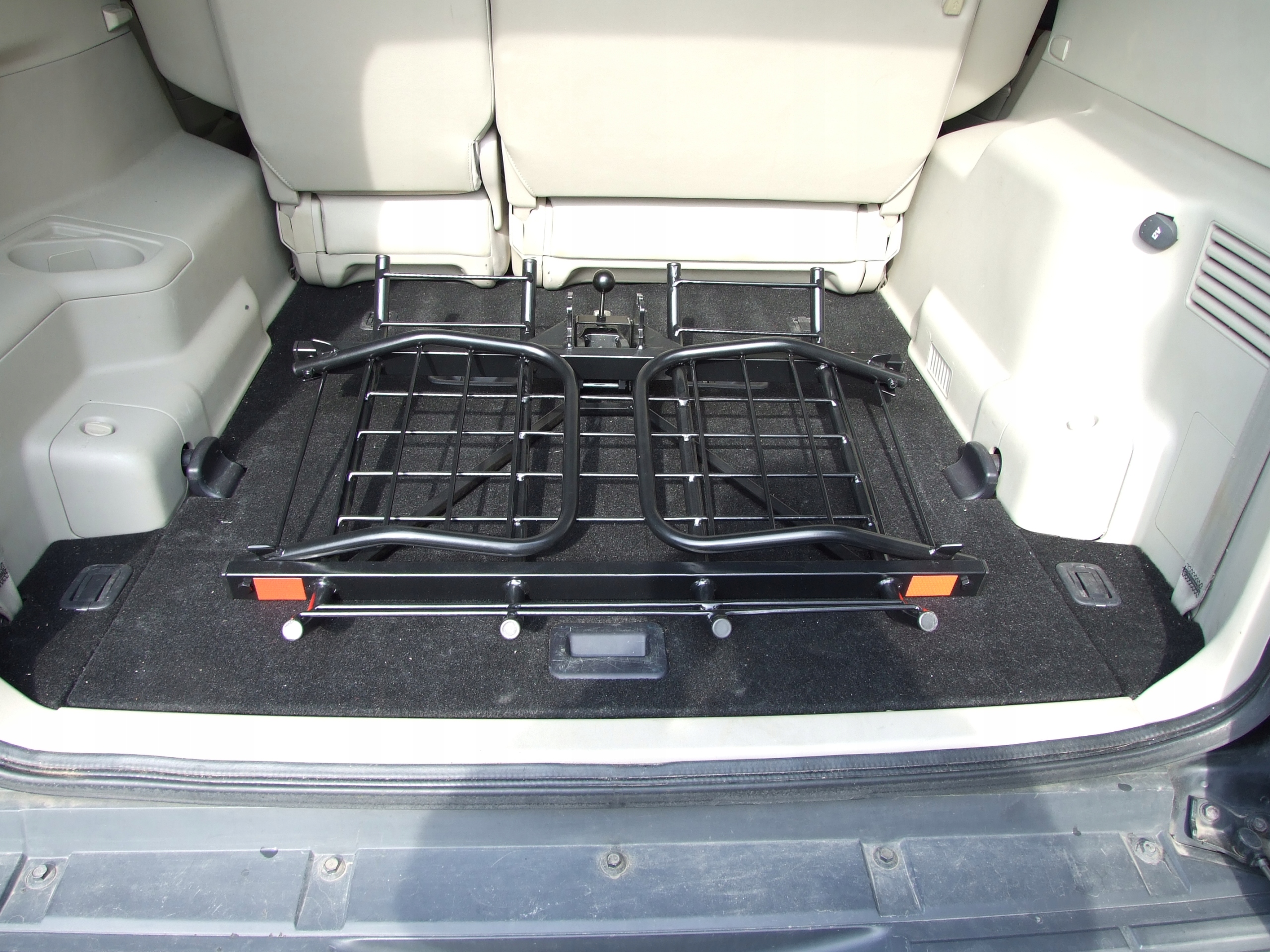 Прочная рама для транспортировки на фаркопе. Изготовлен из толстых стальных стержней, которые можно наклонять для облегчения погрузки.