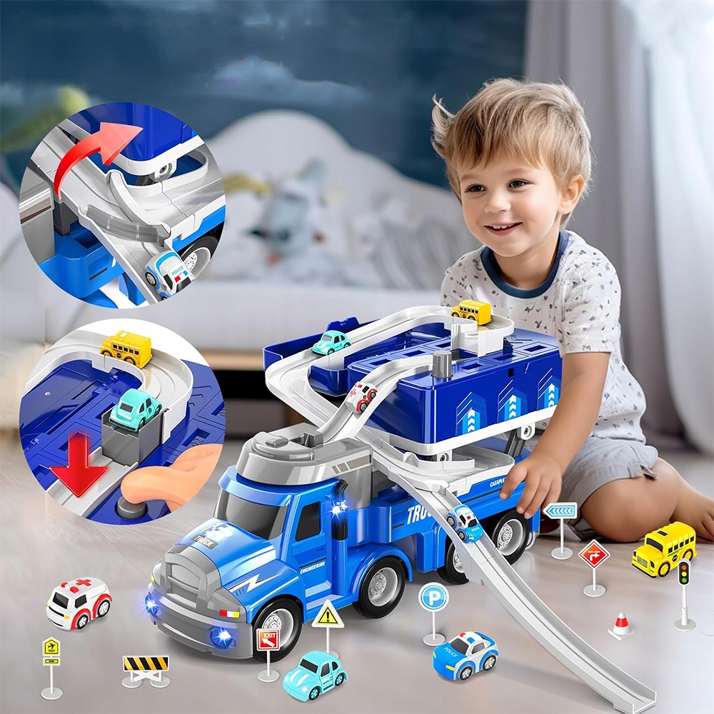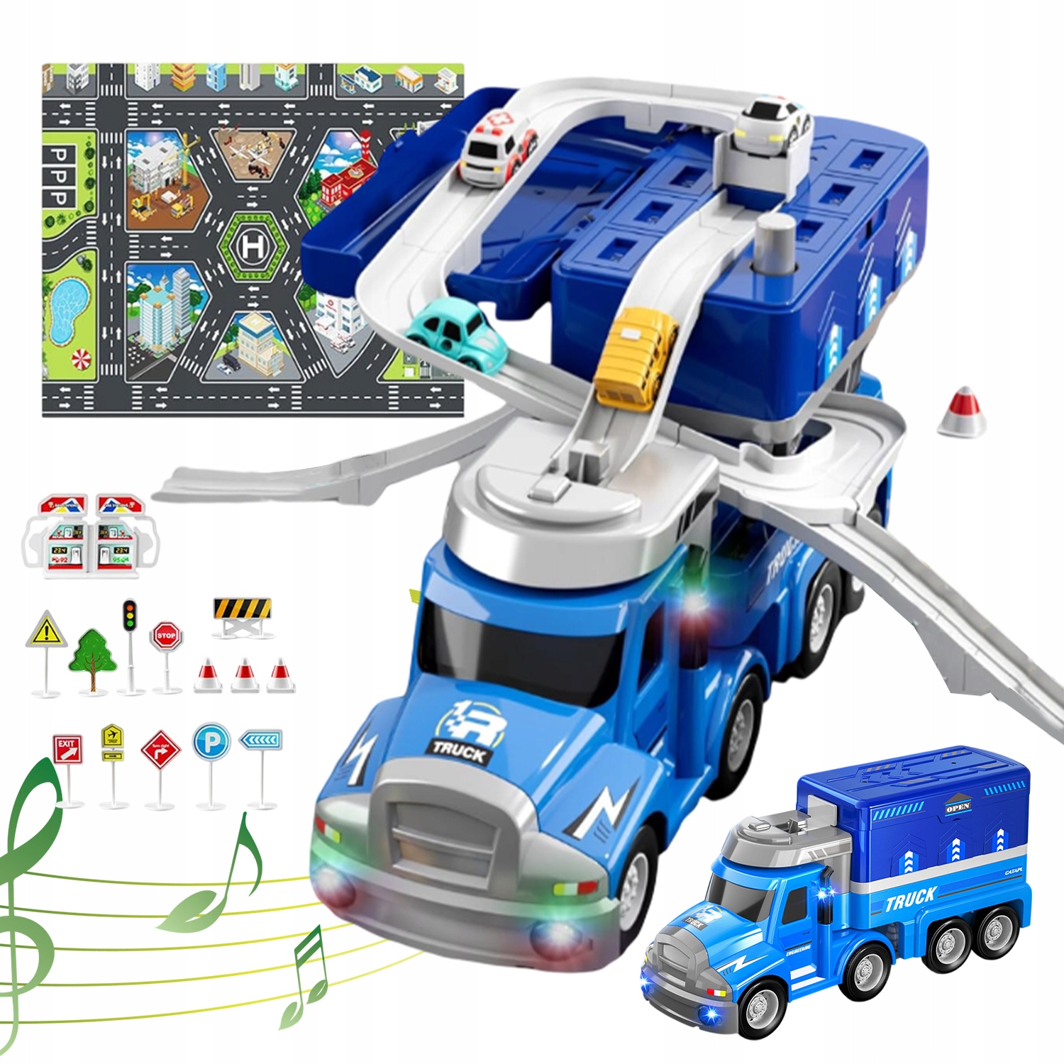 - 💙 Набор включает в себя 1 большой транспортер, 4 мини -транспортные средства и 1 коврик для моделирования реальных сцен.