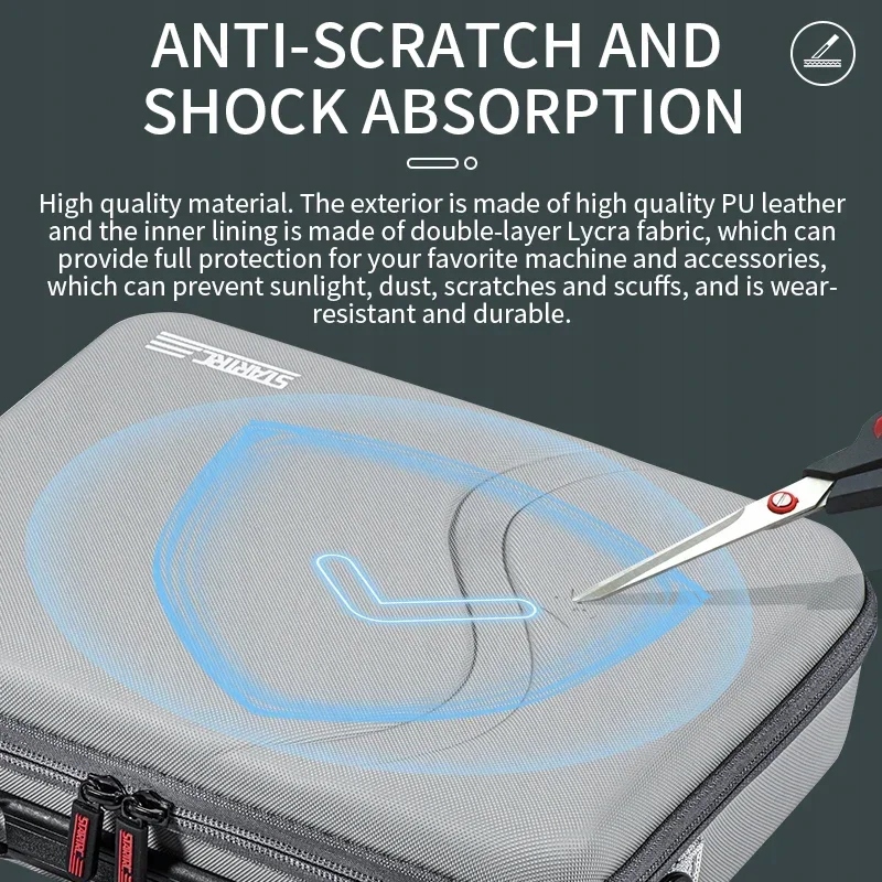Сумка STARTRC изготовлена из прочной искусственной кожи, обеспечивающей защиту от брызгов, пыли, УФ-лучей и царапин. Мягкая подкладка из лайкры внутри поглощает удары, защищая дрон и аксессуары от повреждений.
