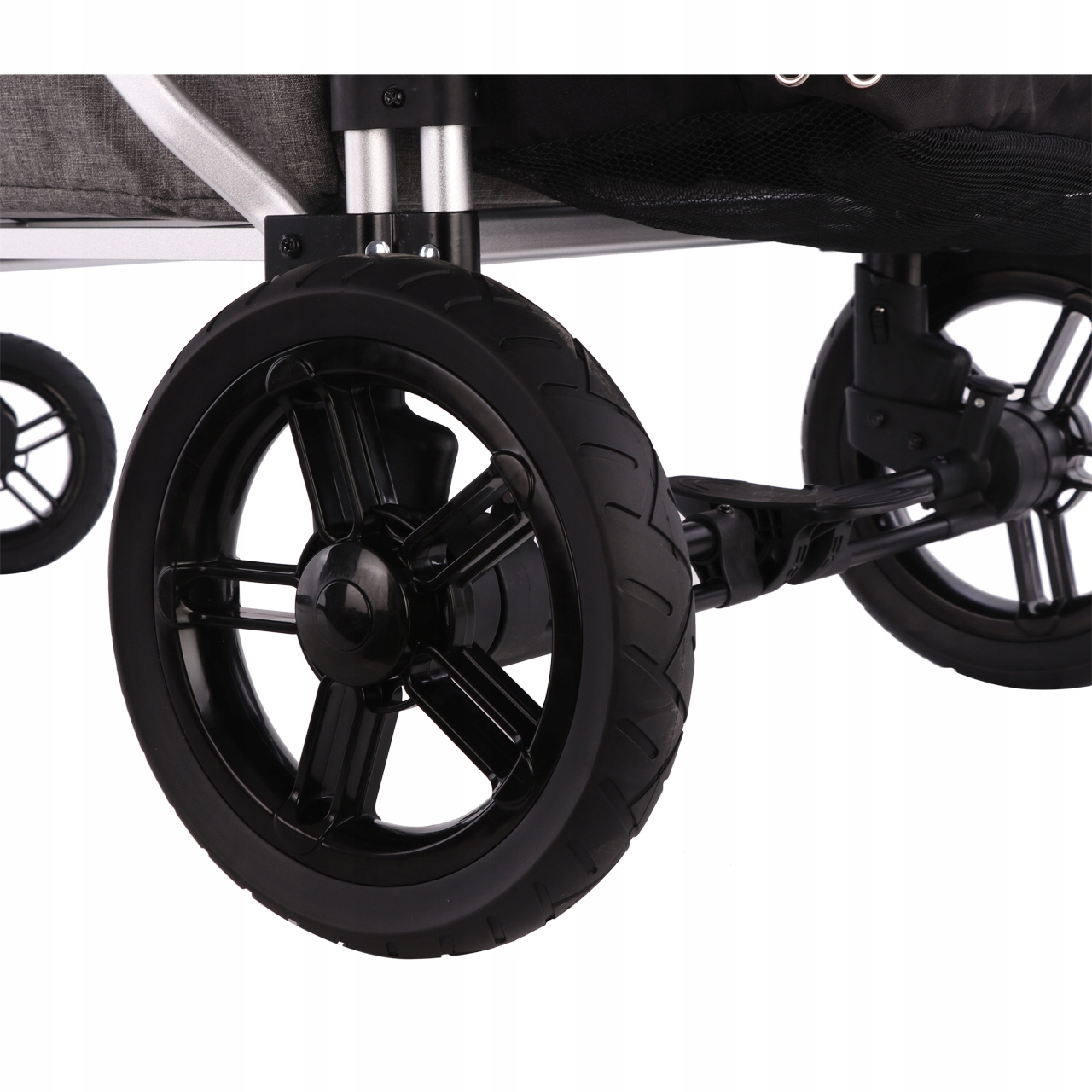 - Все 4 шины — удобные резиновые, каждая из них подрессоренная.