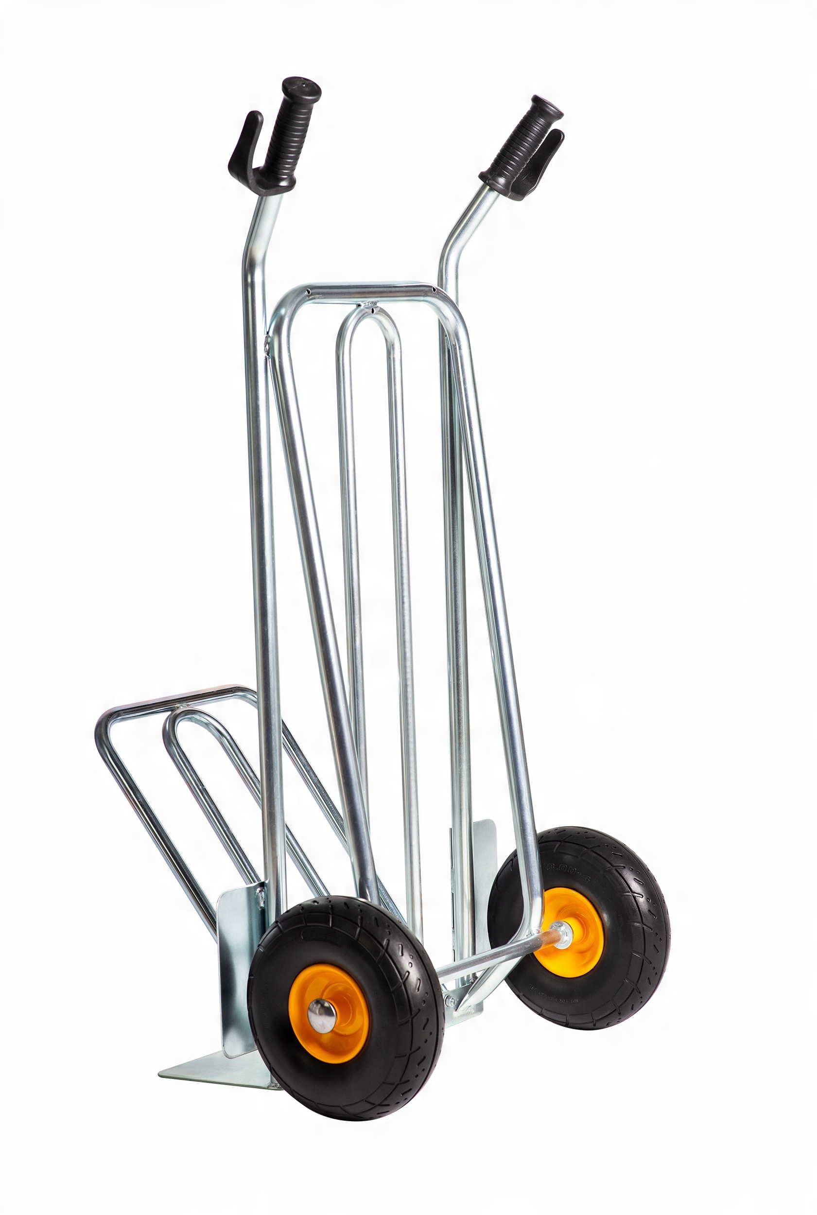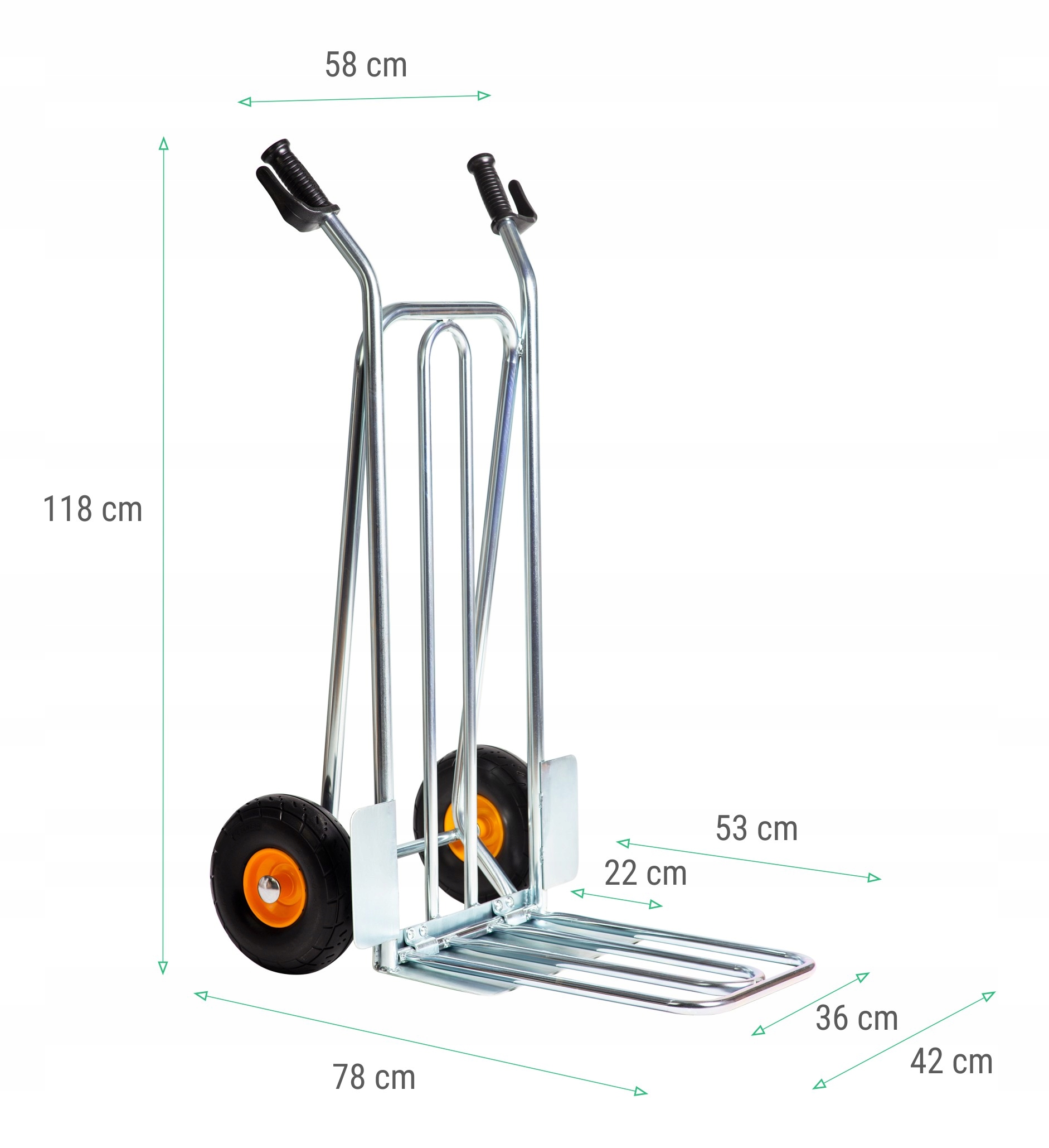Удобная транспортная тележка для любого магазина или склада. Прочная конструкция и прочные колеса из пенопласта позволяют безопасно перевозить грузы. Благодаря дополнительной, большой, складной платформе можно перевозить очень большие грузы.
