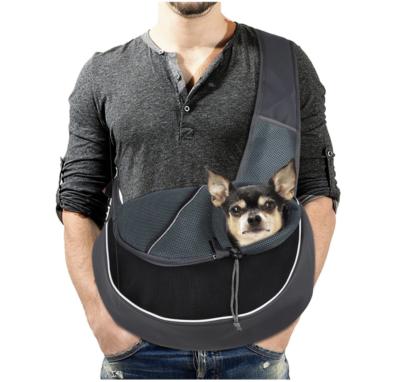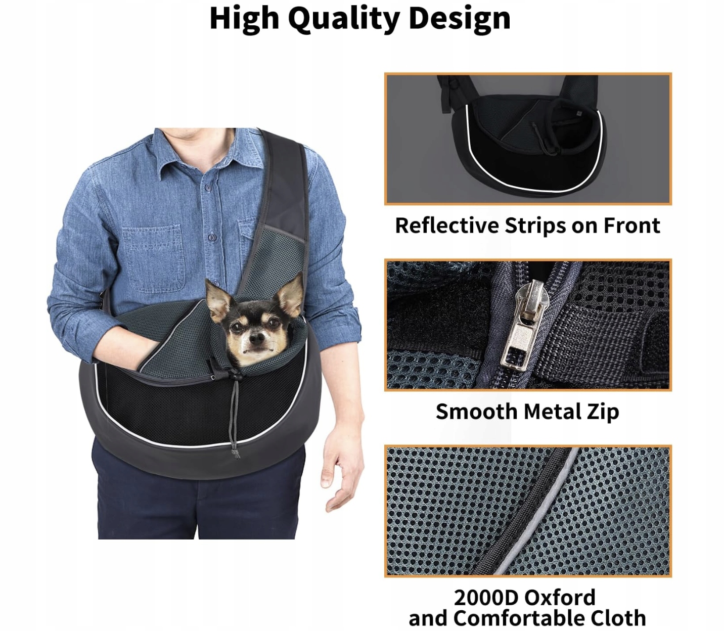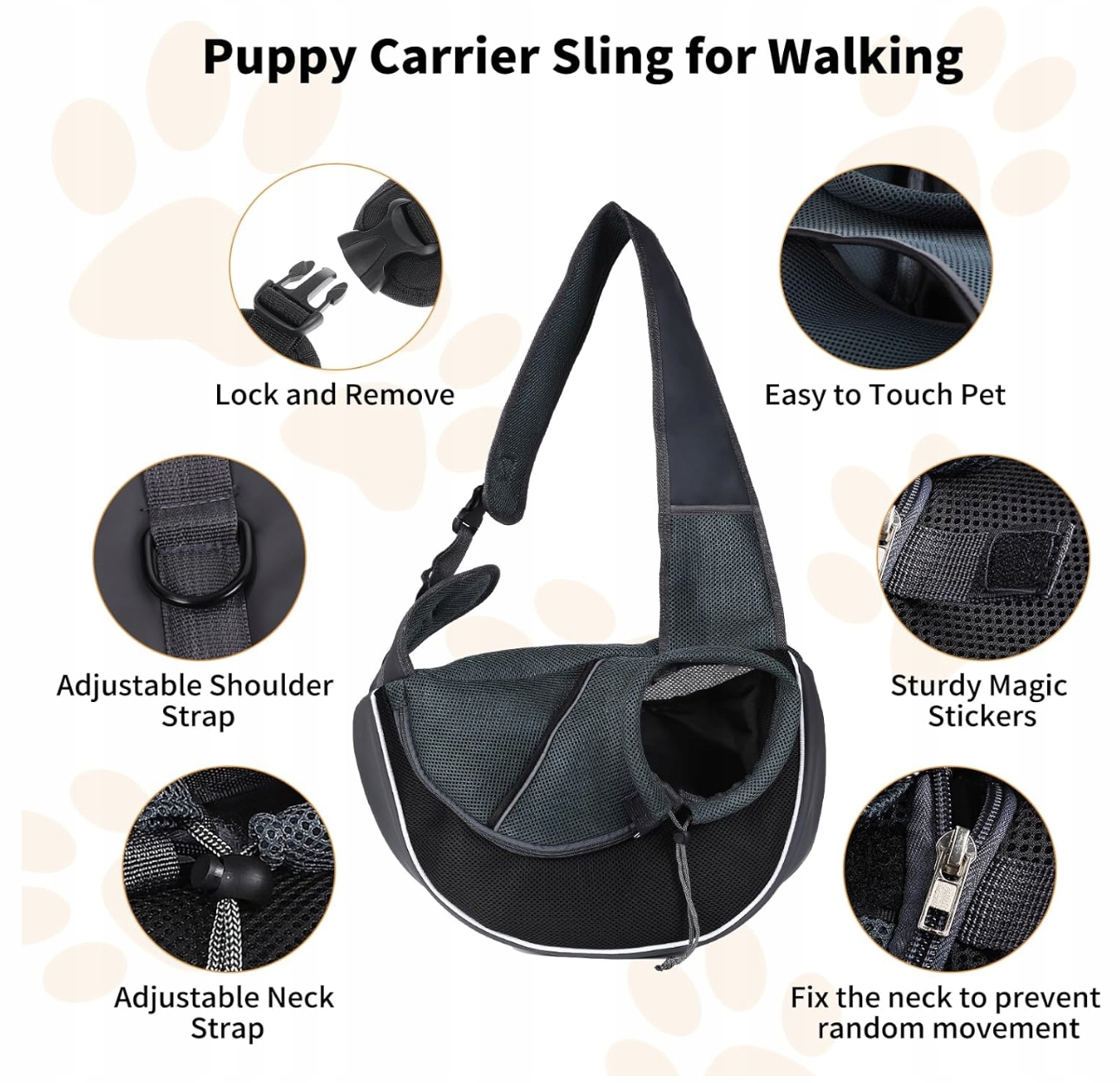 Тройная защита. Слинг для щенка с застежкой-липучкой, регулируемым кольцом и предохранительным крючком. Молния позволяет домашним животным легко входить и выходить, и ее нелегко вырвать; размер тянущего кольца можно отрегулировать по размеру шеи питомца, когда питомец находится в сумке; Карабин внутри сумки можно прикрепить к ошейнику питомца, что эффективно предотвращает случайное открытие молнии животным и предотвращает травмы, вызванные падением.